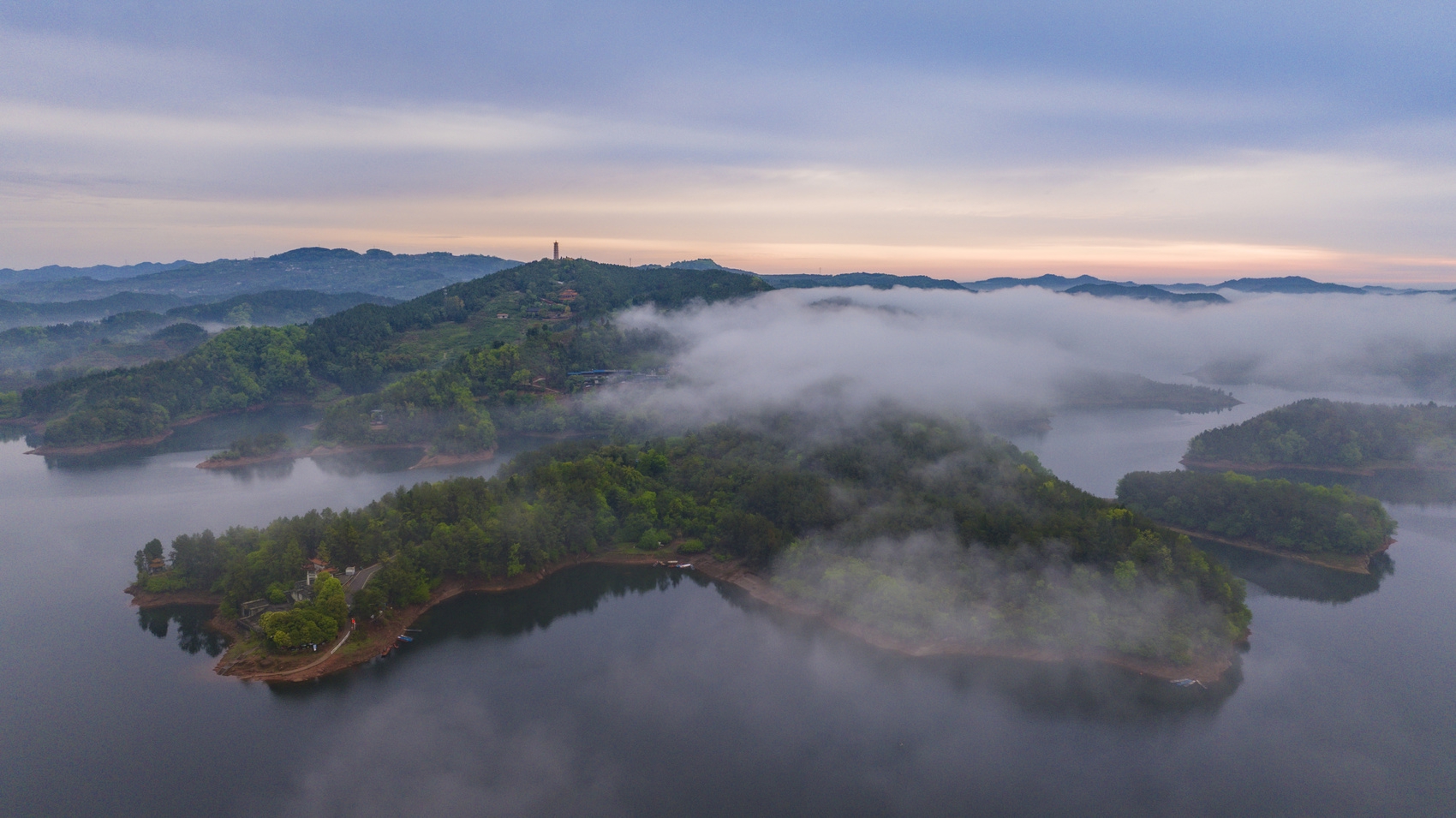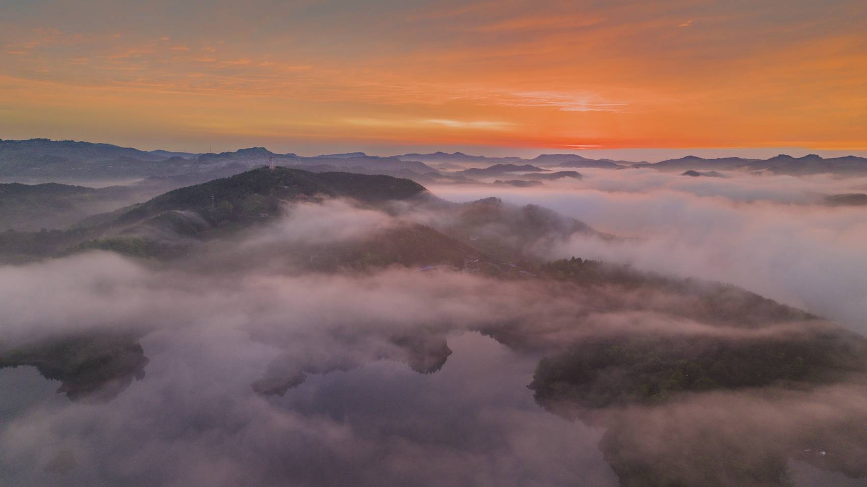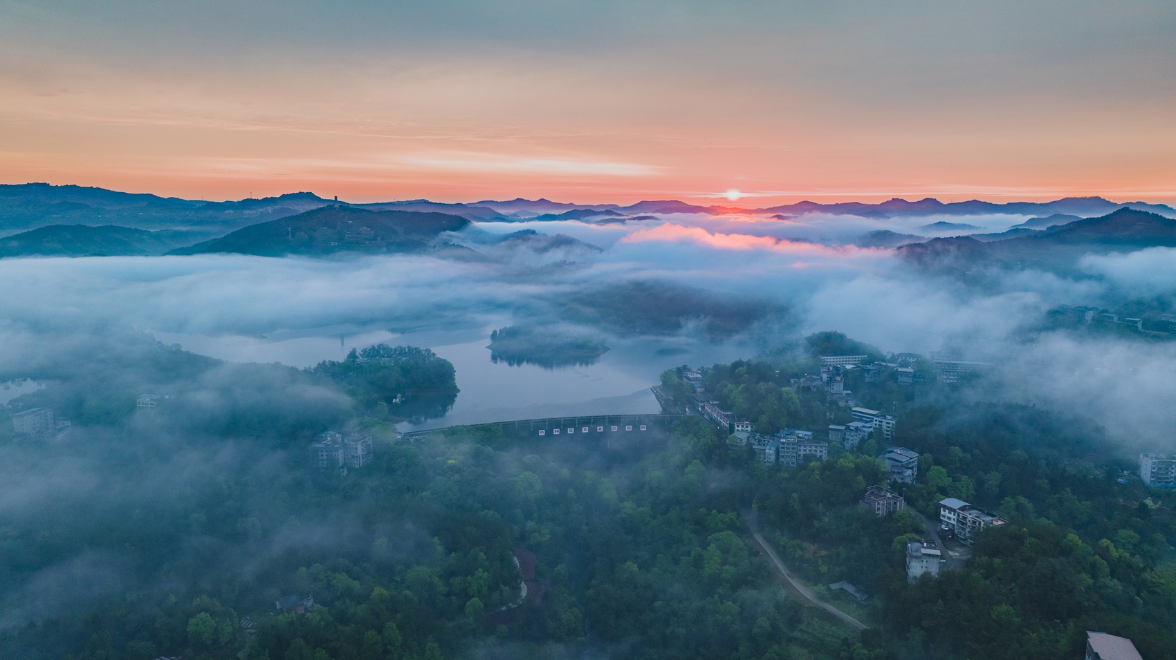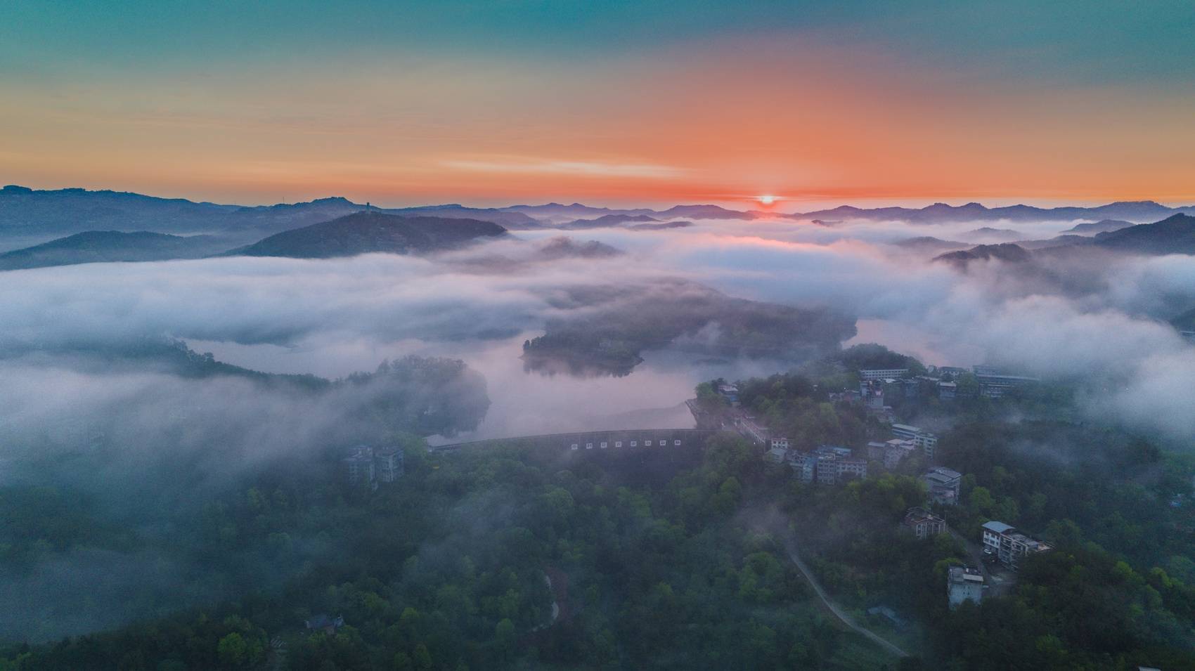 4月12日清晨,当第一缕阳光穿透薄雾,“西蜀第一海”——仁寿黑龙滩逐渐展现出它的壮丽。云雾缭绕的群山之间,旭日缓缓升起,金色的光芒洒向大地,照亮了整个黑龙滩。