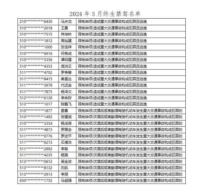 近日,四川省公安厅交警总队向社会集中公布了2024年3月被终生禁驾的26人名单,其中年龄最大的72岁,年龄最小的24岁。