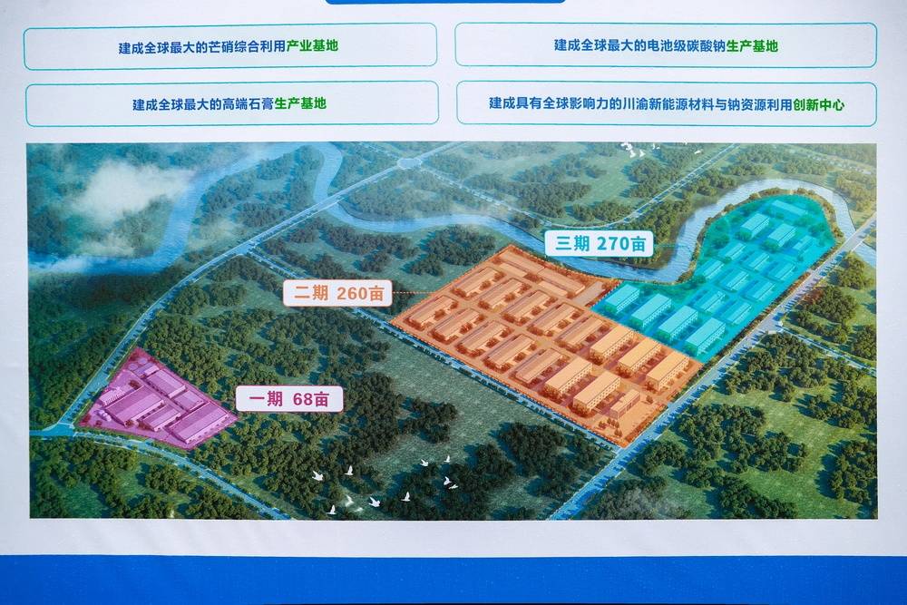 本次活动在雅安钠资源低碳绿色循环利用产业园项目现场进行,这也是第二季度推进的重大项目之一。园区借雅安当地芒硝、电力资源等优势,自主研发芒硝制碱新工艺设备新专利技术,不仅能实现芒硝的高值利用,还能形成绿色循环利用,减少传统工艺上的污染,生产高纯度电池级碳酸钠。园区三期投产将实现年产高纯电池级碳酸钠200万吨,高端石膏280万吨,年产值67亿元以上。