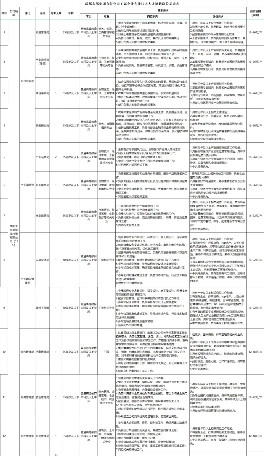 本次拟招聘档案管理、投资管理、产业投资、项目策划、战略研究、合同管理、资金管理、产业运营、企业服务、商业运营、安装设计、装修工程师等12个岗位,共计13名。