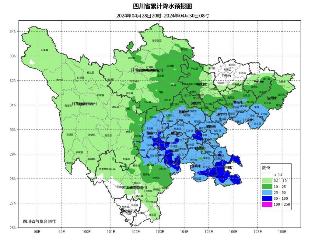根据最新气象资料分析,预计这次降水降温天气过程出现在4月28日晚至5月2 日,在此期间,四川盆地日平均气温将累计下降5—8℃,冷空气影响时普遍有4—6级偏北风,山口河谷可达7级或以上。主要降水出现在28日晚—29 日,盆地大部地方有小到中雨,其中成都、雅安、乐山、眉山、宜宾、泸州、自贡、内江、资阳、遂宁、广安11市和达州、南充2市南部有大雨,局地暴雨,并伴有短时强降水和雷暴,个别地方有冰雹。