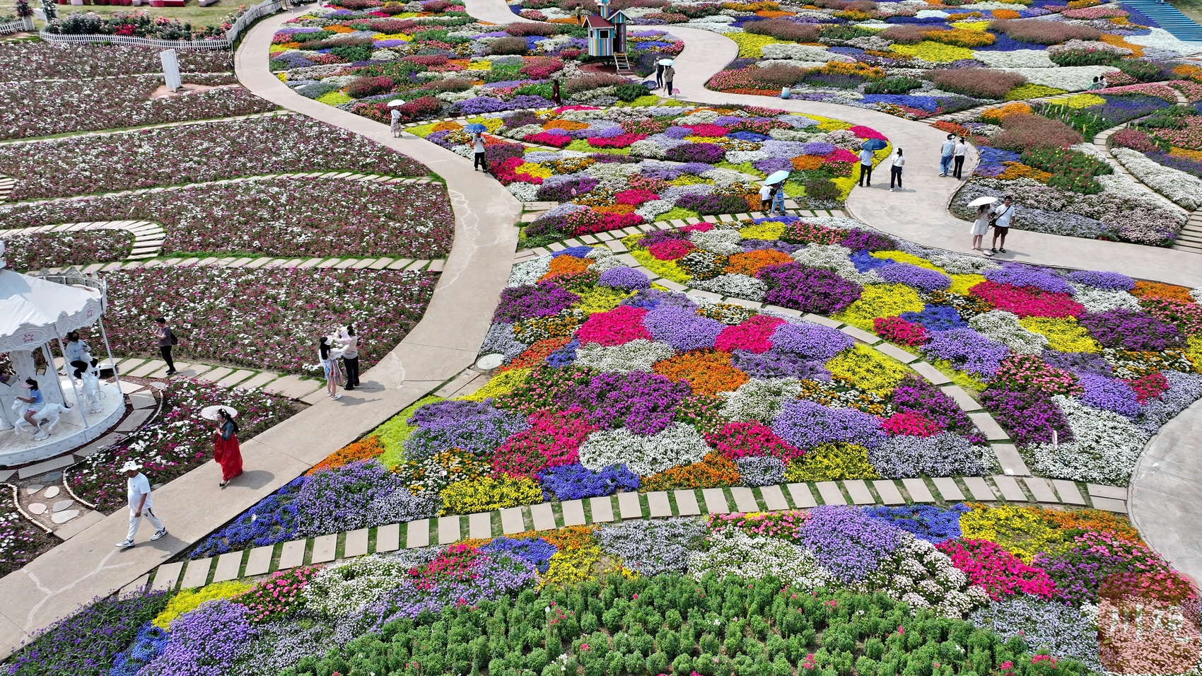 春日里的成都,是一幅绚丽多彩的画卷,处处都充满了生机和活力。连日来,在位于成都市新都区的400多亩漫花庄园700多种花儿竞相绽放。园内9个风格各异的玫瑰园融合了国内外特色造景理念,结合中国传统种植工艺,将玫瑰园打造成一片大自然的调色盘。红色、黄色、白色、橙色、粉色……园内铺成一片五彩的花海,蔚为壮观,吸引众多游客前往。