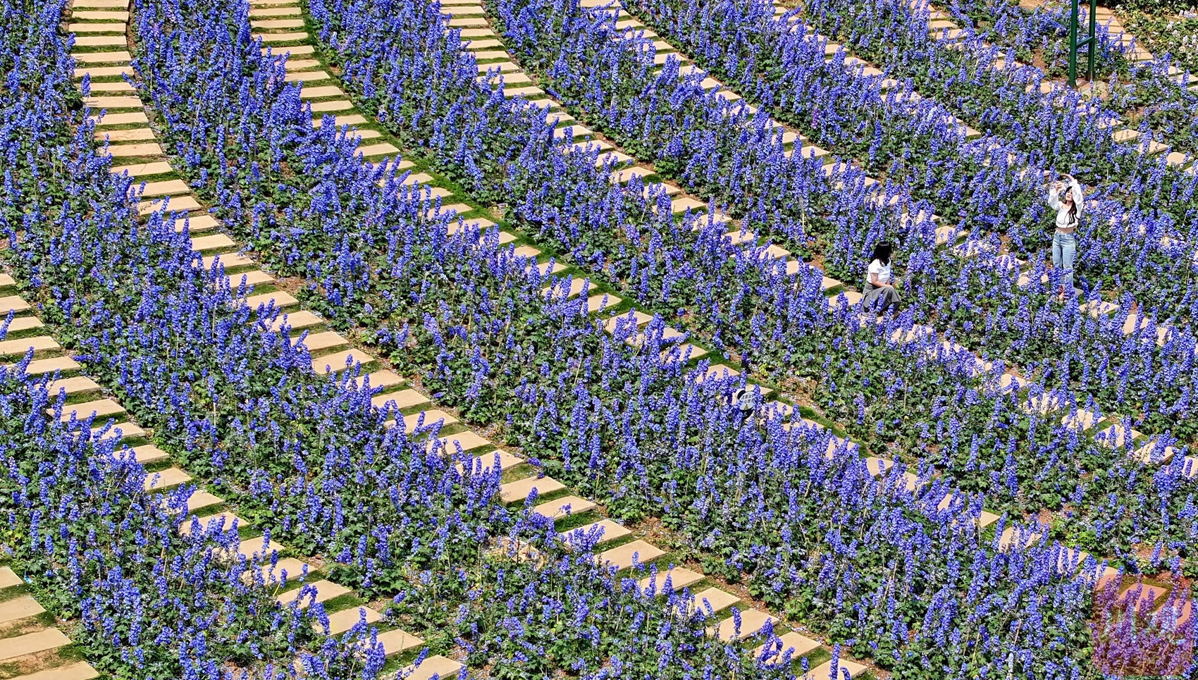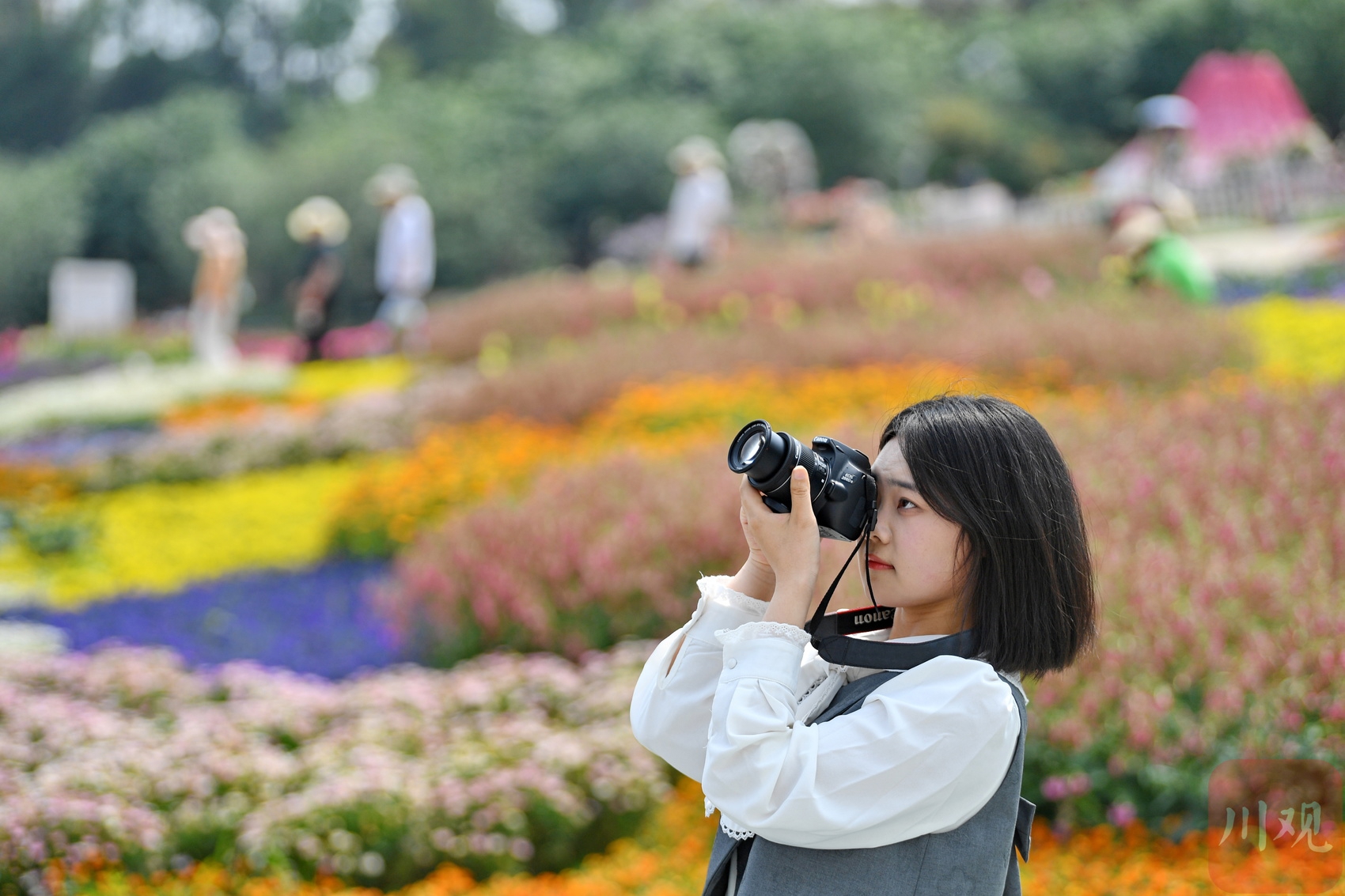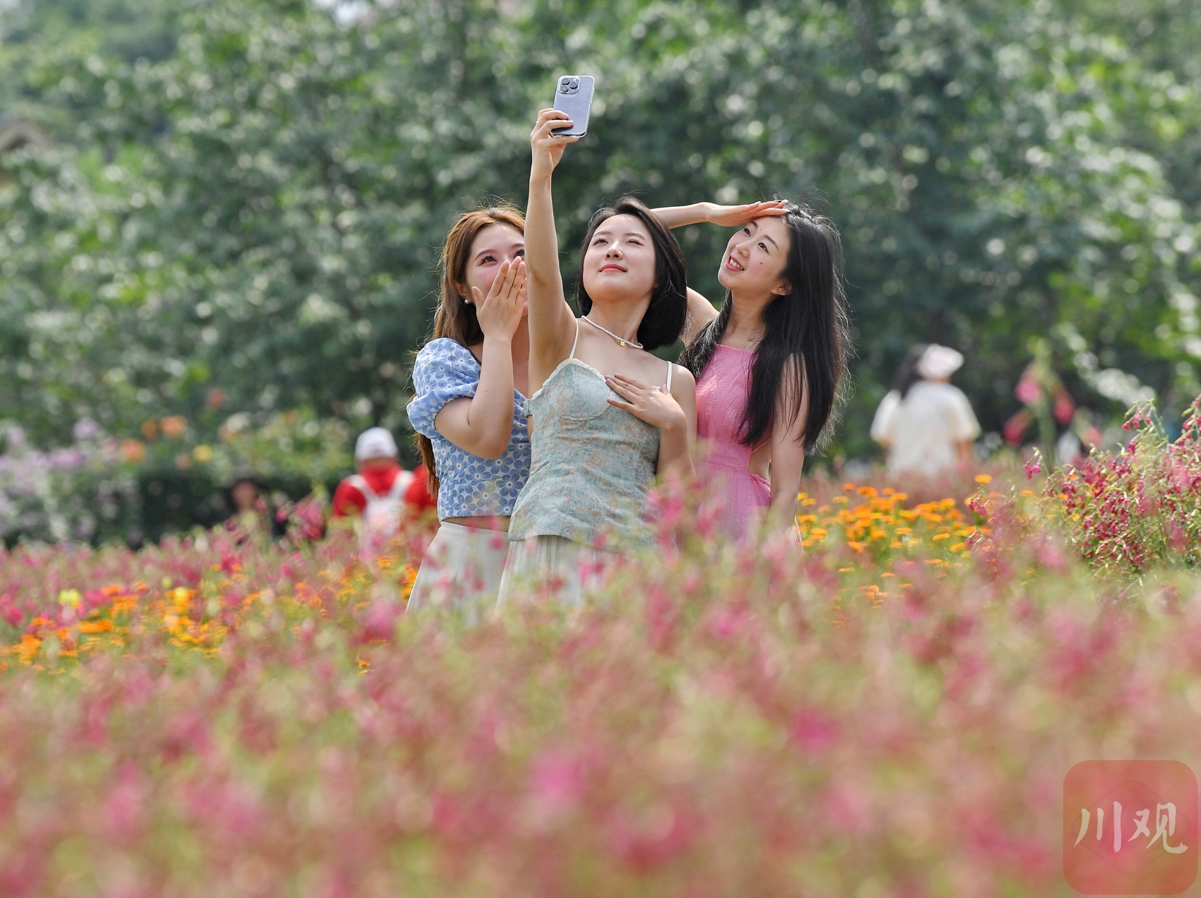 2024年4月27日,游客在漫花庄园里拍照留念。