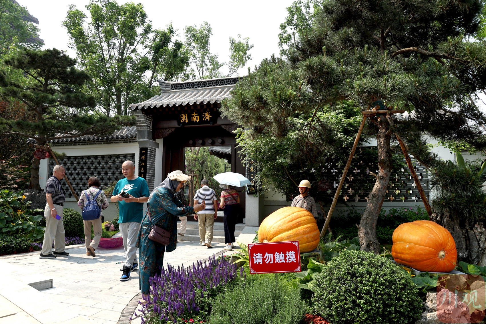 济南园大门前,100公斤左右的大南瓜吸引游人目光。