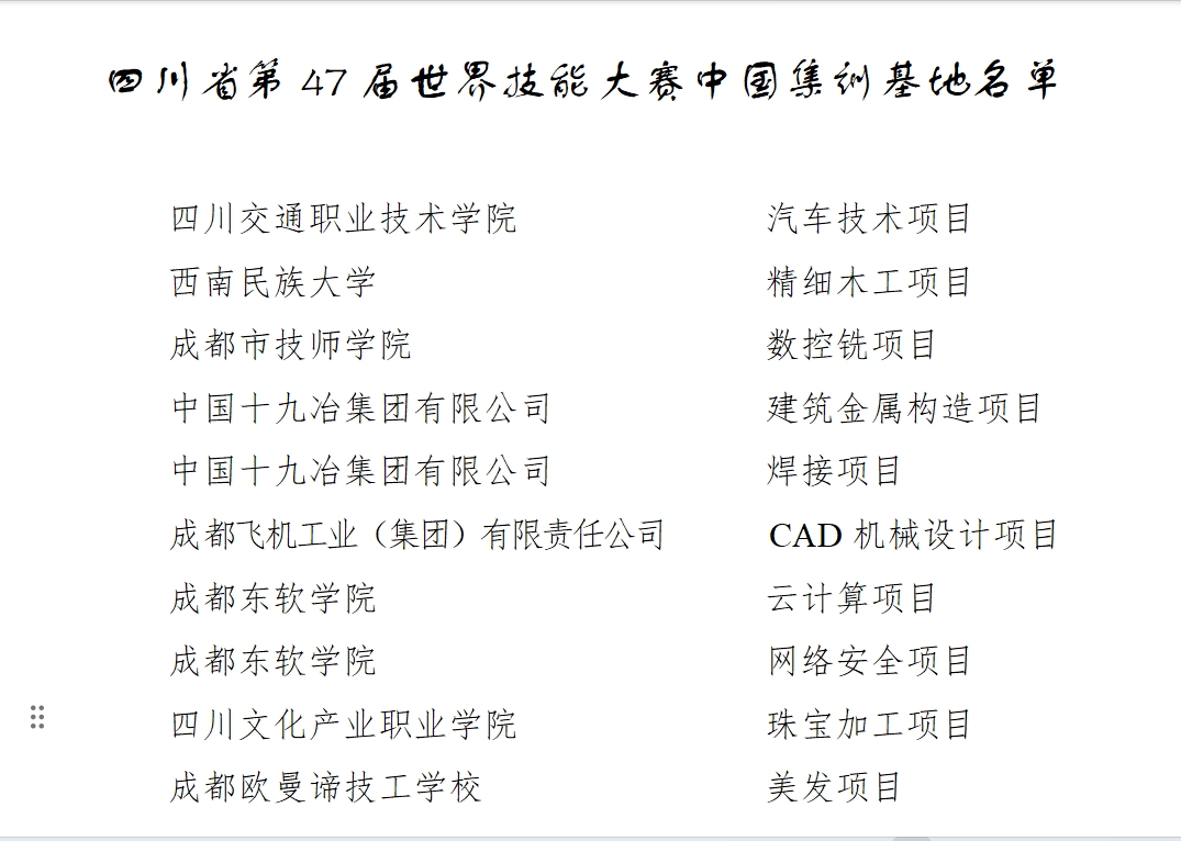 此前,经过公开征集、省级行业主管部门择优推荐、各市(州)人力资源和社会保障局择优推荐等方式,四川省人力资源和社会保障厅遴选申报了一批项目参加第47届世界技能大赛中国集训基地评选。根据人力资源社会保障部相关要求,成都市技师学院、四川交通职业技术学院等10个基地被确定为第47届世界技能大赛中国集训基地。
