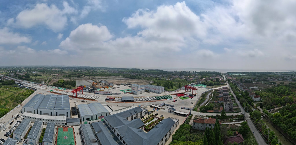 4月29日空中俯瞰位于上海崇明的沪渝蓉高铁崇太长江隧道“领航号”盾构机始发现场(无人机全景照片)。