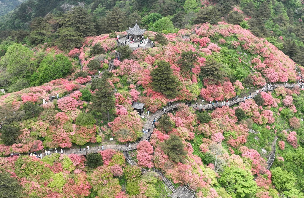 近日,湖北省麻城市龟峰山景区的十万亩连片杜鹃花进入盛花期,吸引各地游客前来赏花。龟峰山景区天然古杜鹃群落平均树龄在百年以上,每年春季,集中连片的杜鹃花绽放,形成红色花海,美不胜收。