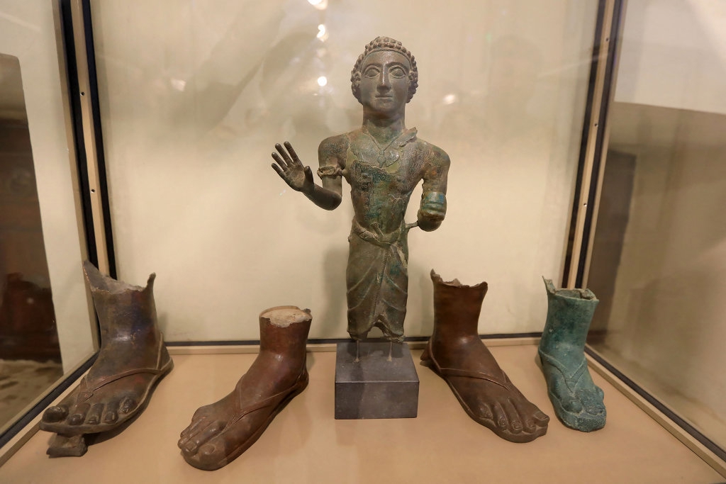 这是4月28日在位于也门首都萨那的国家博物馆内拍摄的文物。