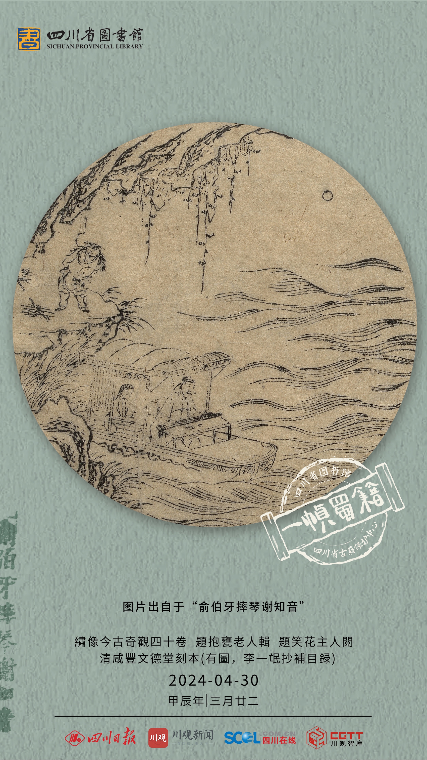 4月30日,一帧蜀籍带你继续相约《今古奇观》。今天,海报所选图为源于书中的《俞伯牙摔琴谢知音》。这件作品通俗易懂,是中国古代话本的典范之一。