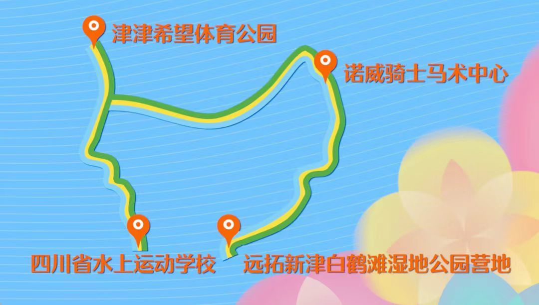 从四川省水上运动学校启程,感受龙舟竞渡的魅力,沿线路过津津希望体育公园、诺威骑士马术中心,来到远拓新津白鹤滩湿地公园营地,体验运动生活的乐趣。