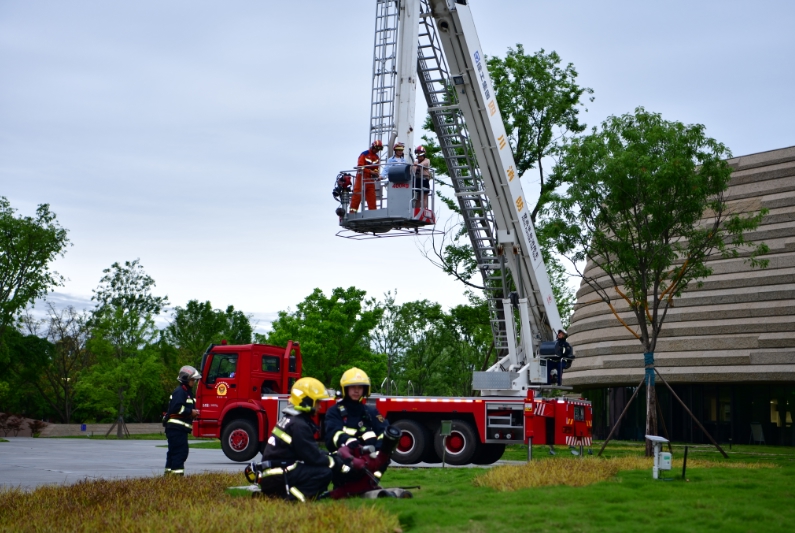供水保障、安全管控、通信支撑……到达现场后,救援人员迅速行动,侦察组深入现场侦查火情,灭火组铺设水带水枪内攻“灭火”,抢险救援组“排烟”、破拆,成功救出两名被困人员,举高外控组持续为博物馆外墙喷水降温,堵截“火势”蔓延。各小组配合默契,演练紧张有序,达到了预期效果。