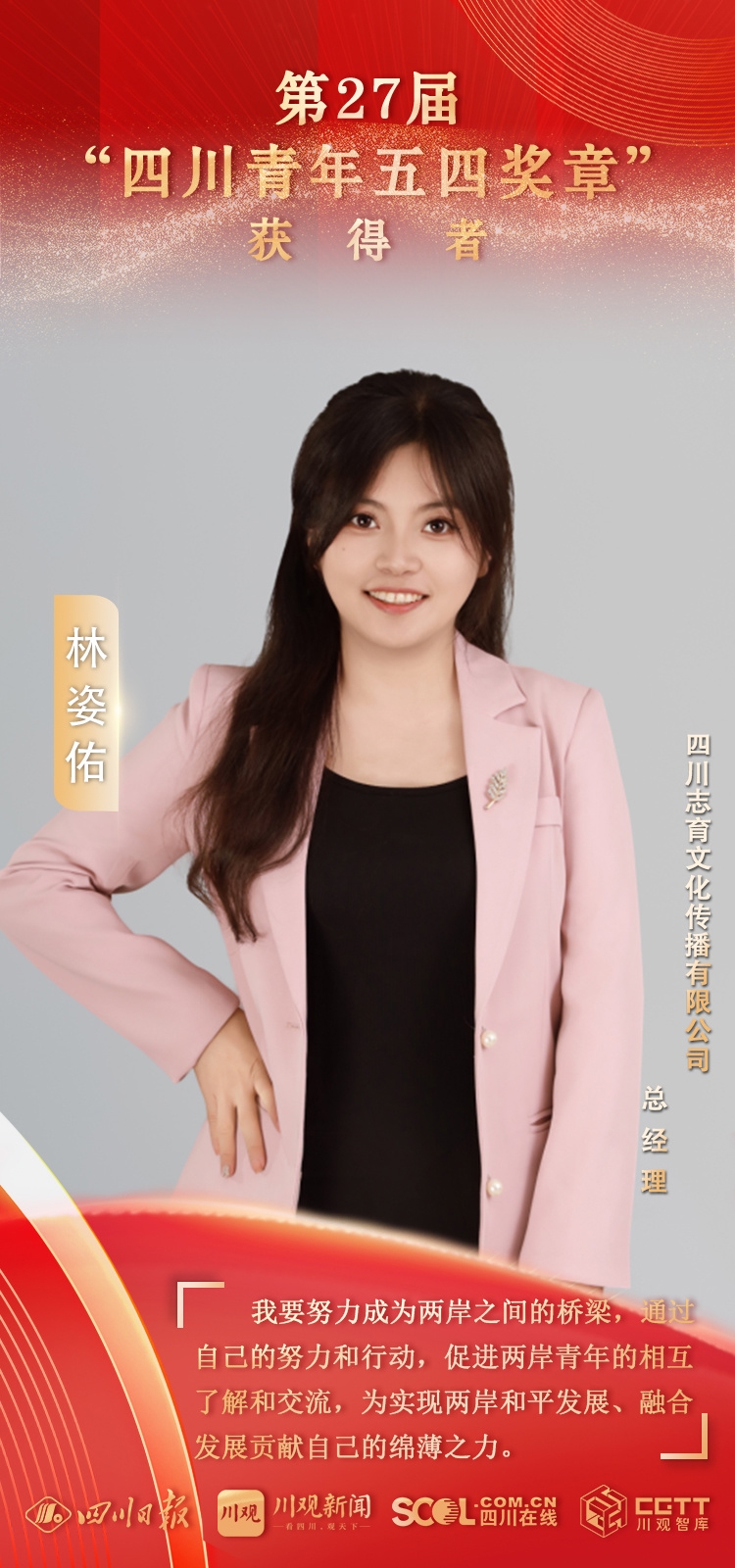 林姿佑,“90后”台青,现任四川志育文化传播有限公司总经理。她出生于台湾省彰化县,热心公益事业,致力青少年素质教育,积极参与助推两岸交流合作、融合发展,如“两岸青年同唱一首歌”“2023海峡青年论坛—川台青年创新创业交流合作论坛”等。近日,林姿佑获第27届“四川青年五四奖章”荣誉称号,是目前为止第二位获此殊荣的在川台湾青年。