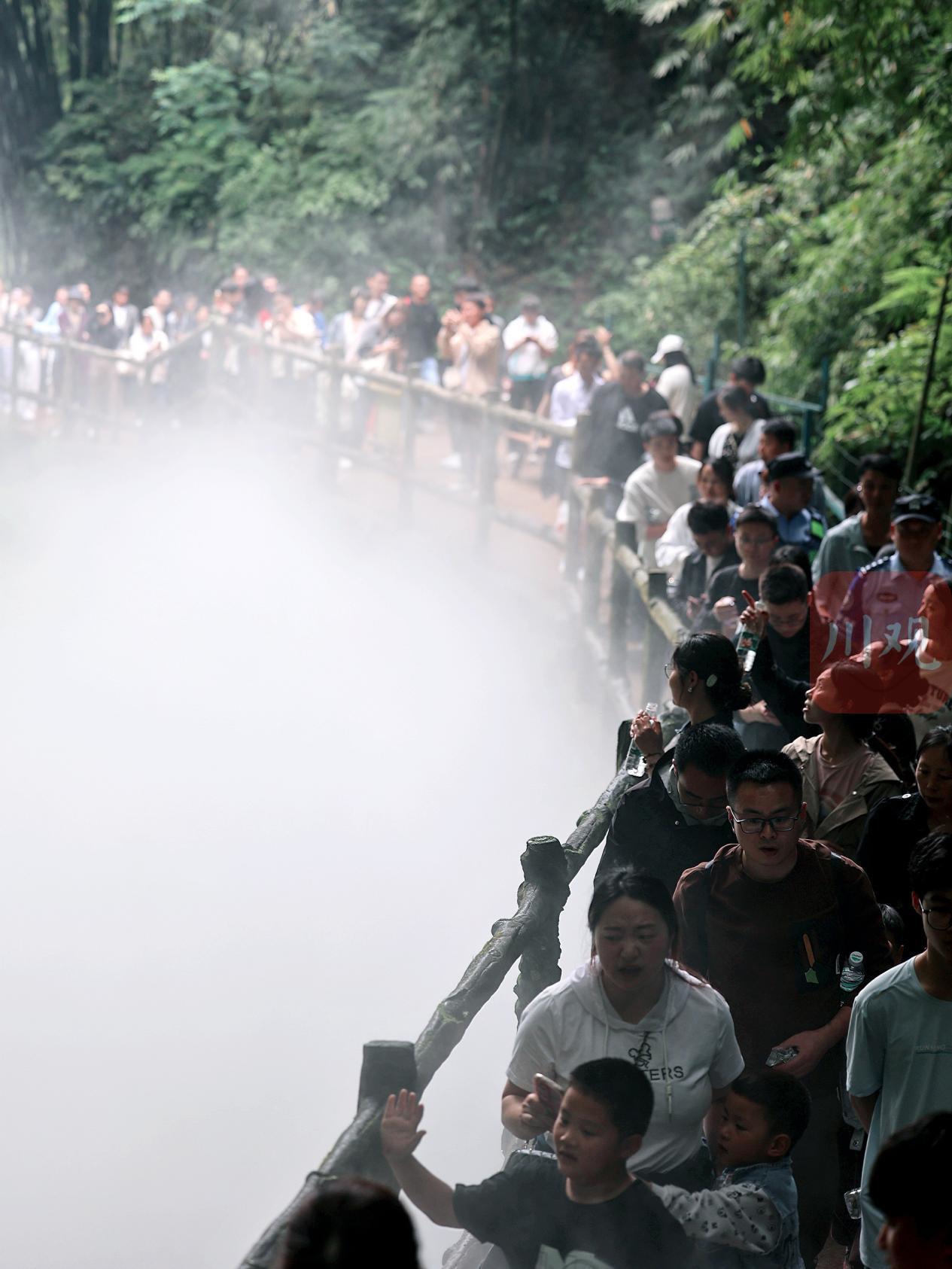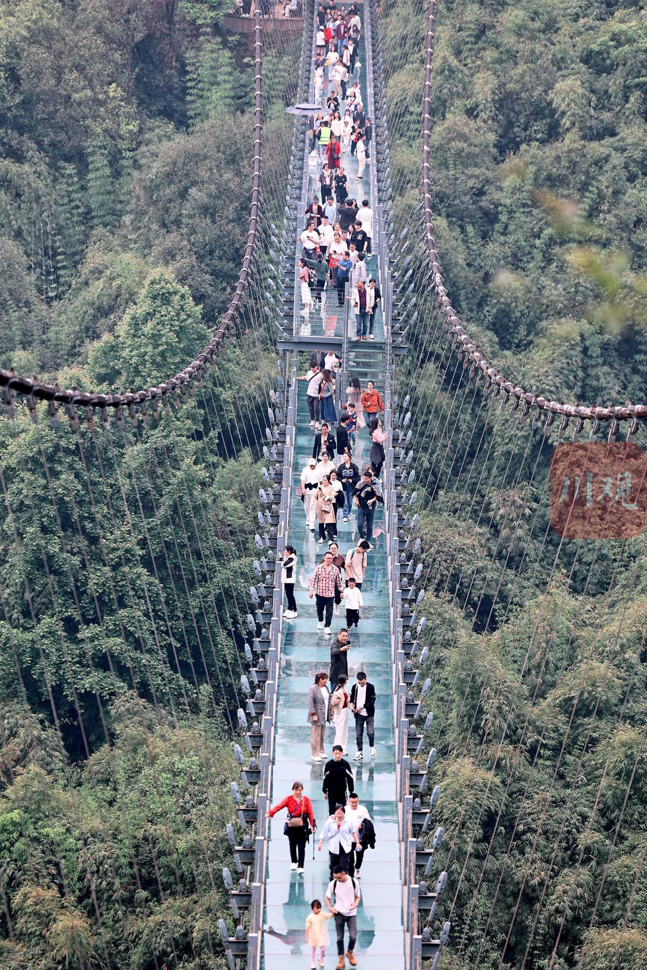 游客在川西竹海景区体验烟雨朦胧的梦幻之旅。