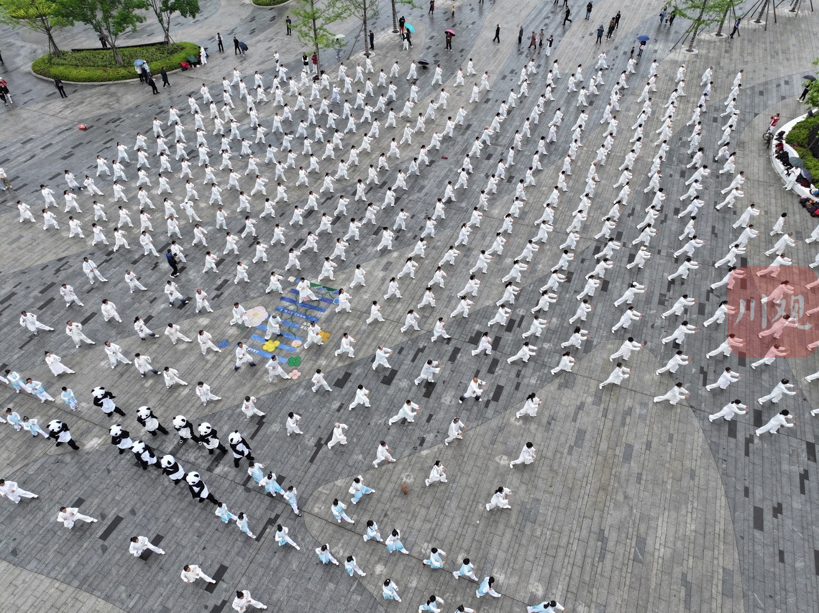 5月1日,成都融创乐园魔方广场上,国家级非遗项目省级传承人刘绥滨和来自都江堰市太极拳协会、都江堰市老年体育协会、都江堰市青城小学的1000余名太极拳爱好者与大熊猫人偶随着音乐缓缓起势,展现了一场精彩的太极拳表演。