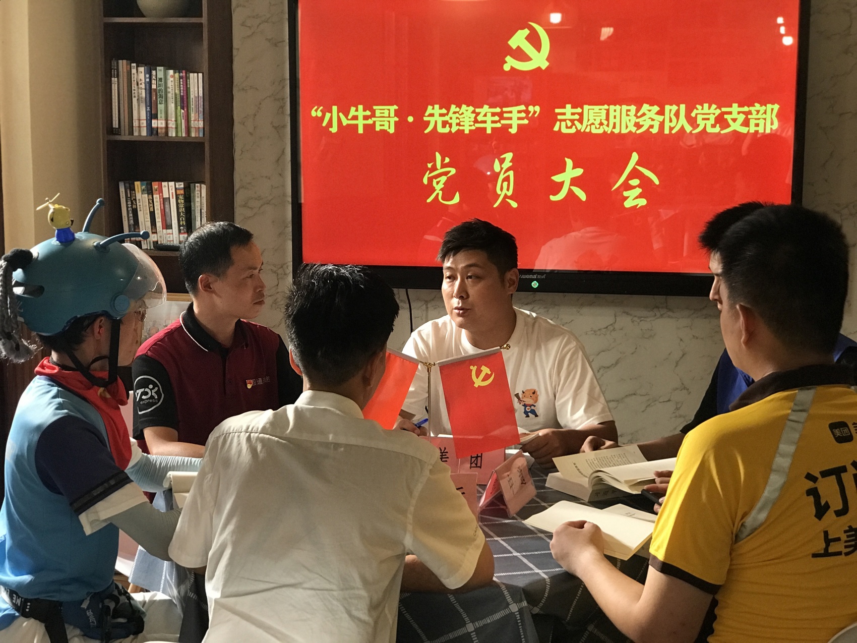 图为成都市锦江区新就业群体基层党组织代表——“小牛哥·先锋车手”志愿服务队党支部正在召开党员大会。