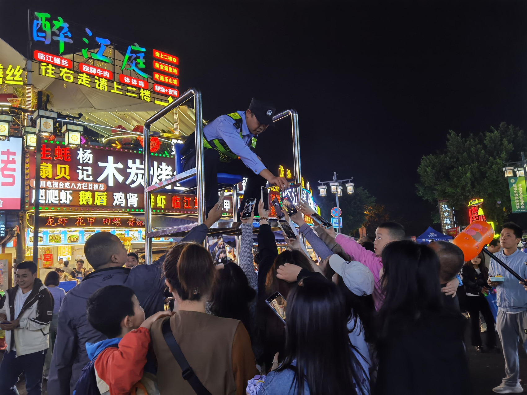 乐山张公桥好吃街执勤民警为游客代拍 乐山市公安局供图