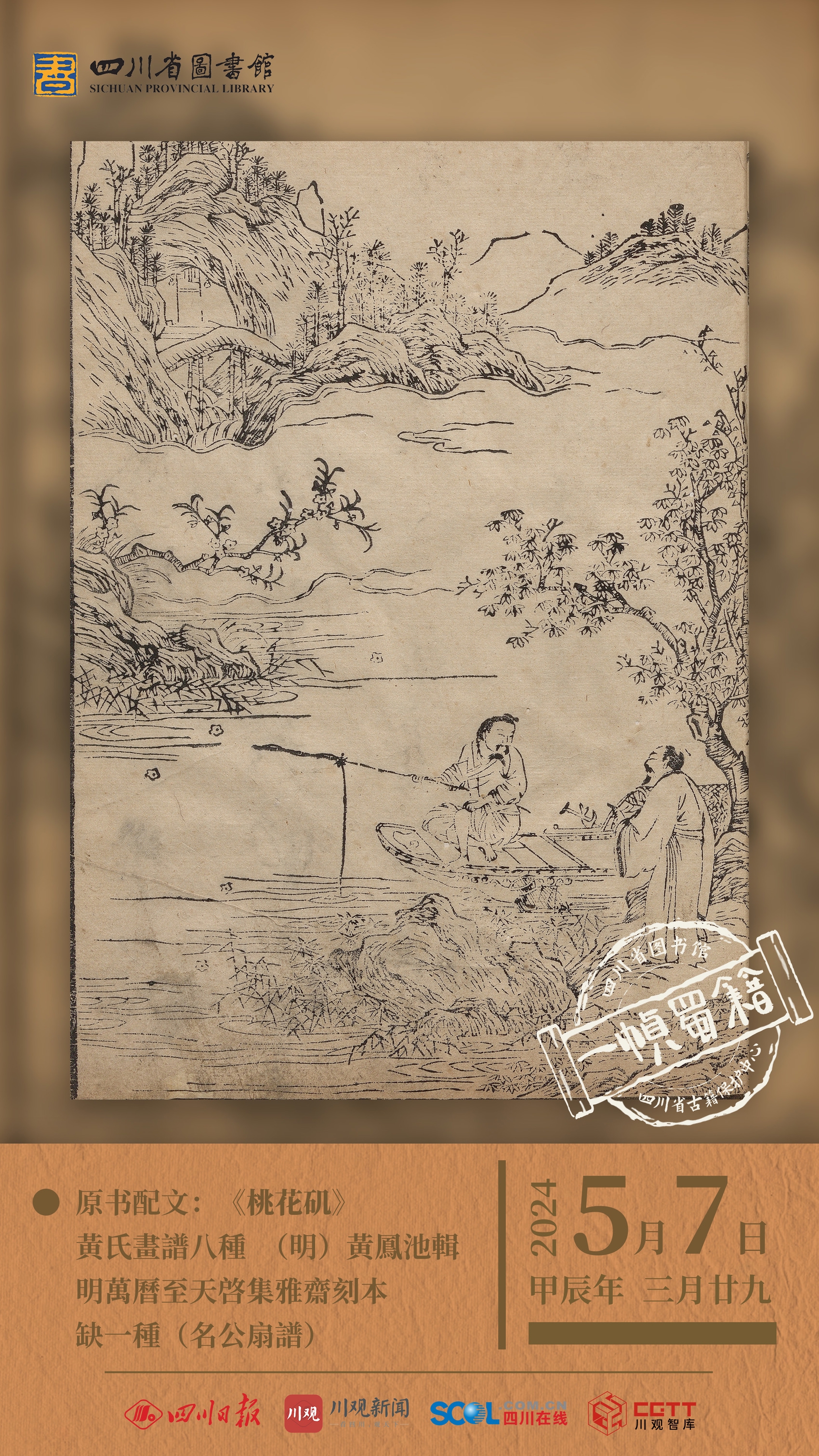 5月7日,一帧蜀籍继续和你相约《黄氏画谱》。该书由明黄凤池编,海报所用图源于明万历至天启集雅斋刻本。作为一本画谱,该书收录名诗,且由名家手书上版,其图造境高雅,格调绝佳,细腻精绝。
