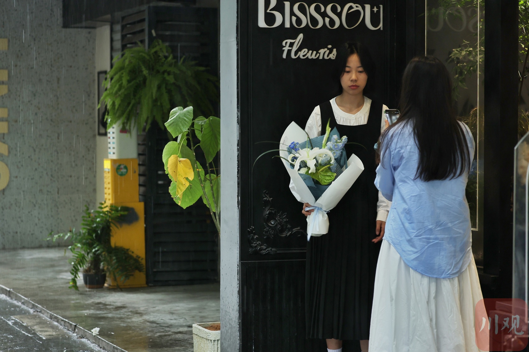 下雨中,捧着鲜花拍个照