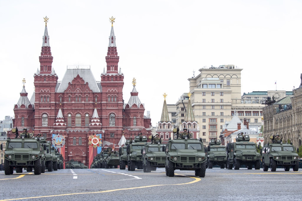 5月9日,在俄罗斯首都莫斯科,军车编队驶过红场。