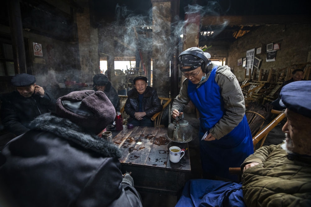 2021年11月23日,在成都市双流区彭镇观音阁老茶馆,老板李强(右二)为茶客们添水。新华社记者 沈伯韩 摄
