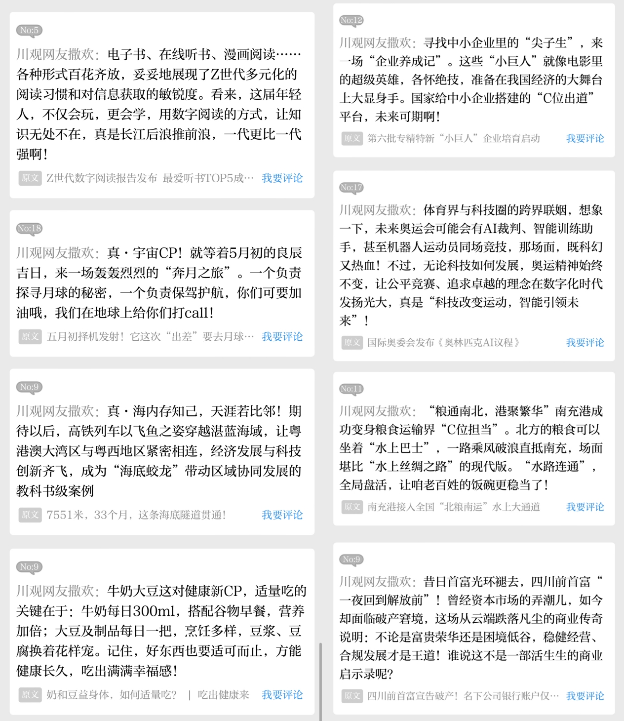 (川观网友“撒欢”每日悦评榜部分上榜评论)