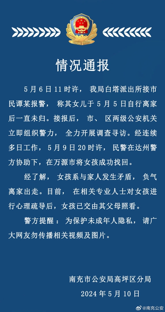 5月10日上午,南充公安通报:失联5天的16岁高一女孩被找到。