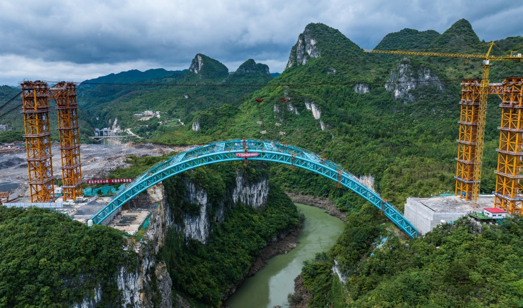 拉密河特大桥钢管拱肋合龙现场(5月10日摄,无人机照片)。