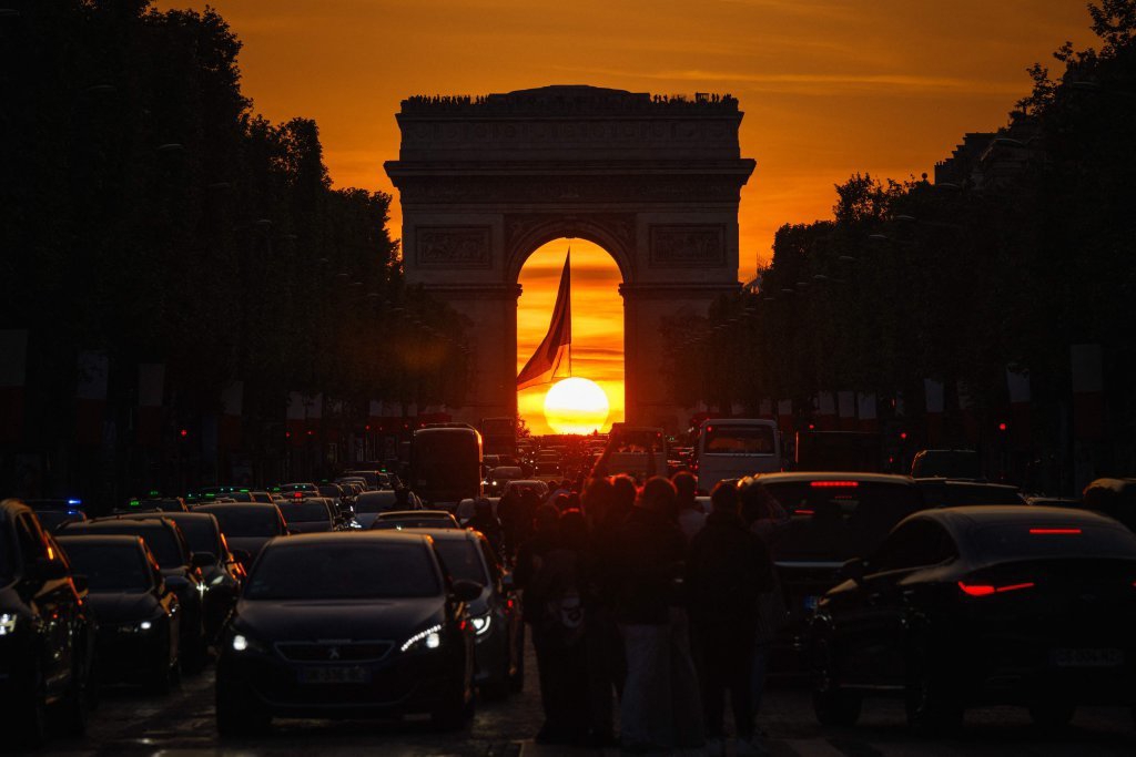 5月9日,法国巴黎香榭丽舍大街出现悬日景观,人们纷纷驻足拍摄凯旋门日落。