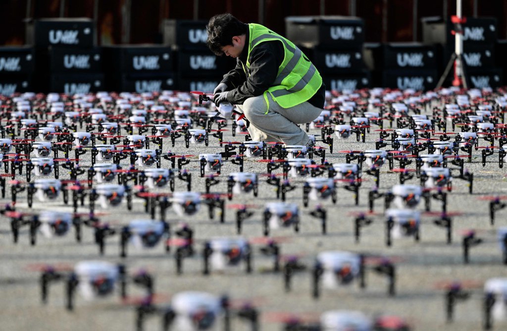 5月9日,在韩国仁川,工作人员检查在无人机灯光秀上使用的无人机。作为2024韩国无人机展的一部分,一场无人机灯光秀9日在韩国仁川举行。