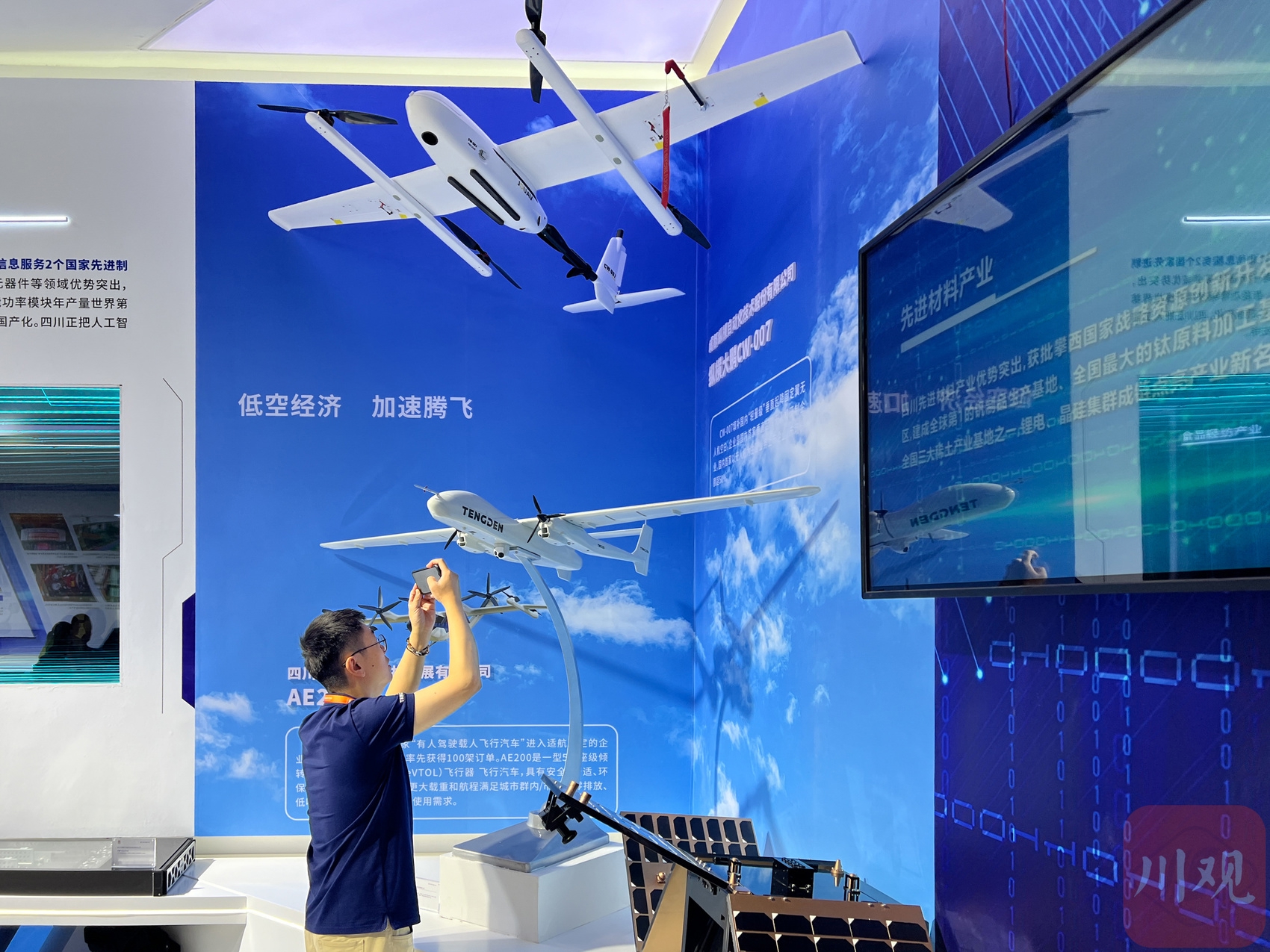 在四川馆的电子信息产业板块,不止“双尾蝎”这一款无人机产品,也有填补了国内空白的“轻量级”垂直起降固定翼无人机。省发展改革委相关负责人介绍,四川把电子信息产业与航空工业优势相结合,开辟出了无人机产业新赛道。