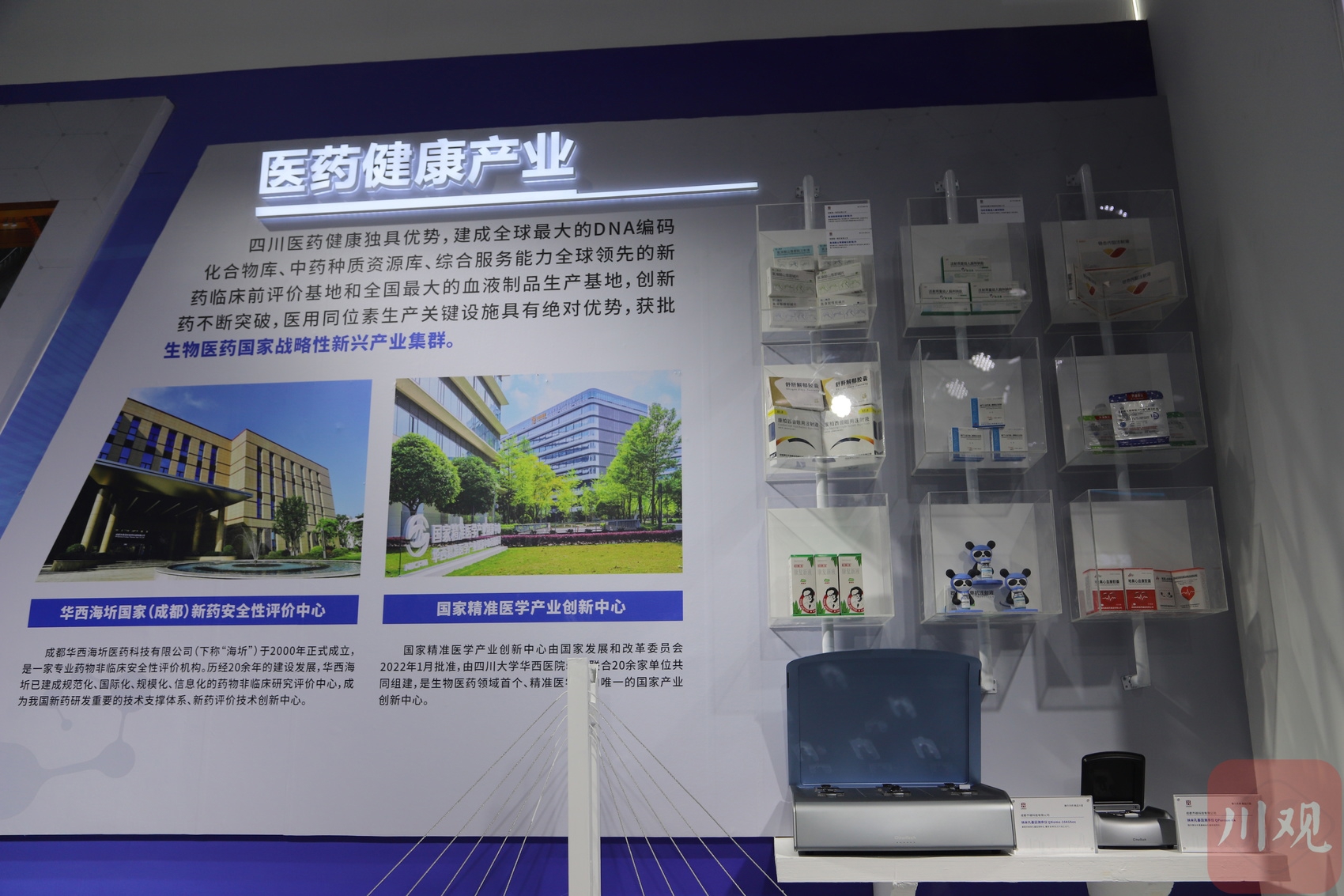 而在一旁的医药健康产业展区,虽然看起来墙上只有9个小箱子,但里面的展品大有来头。据了解,这些“四川造”的标签不是“首批”“首款”就是市场占有率第一,充分展现了四川在医药领域的不俗实力。