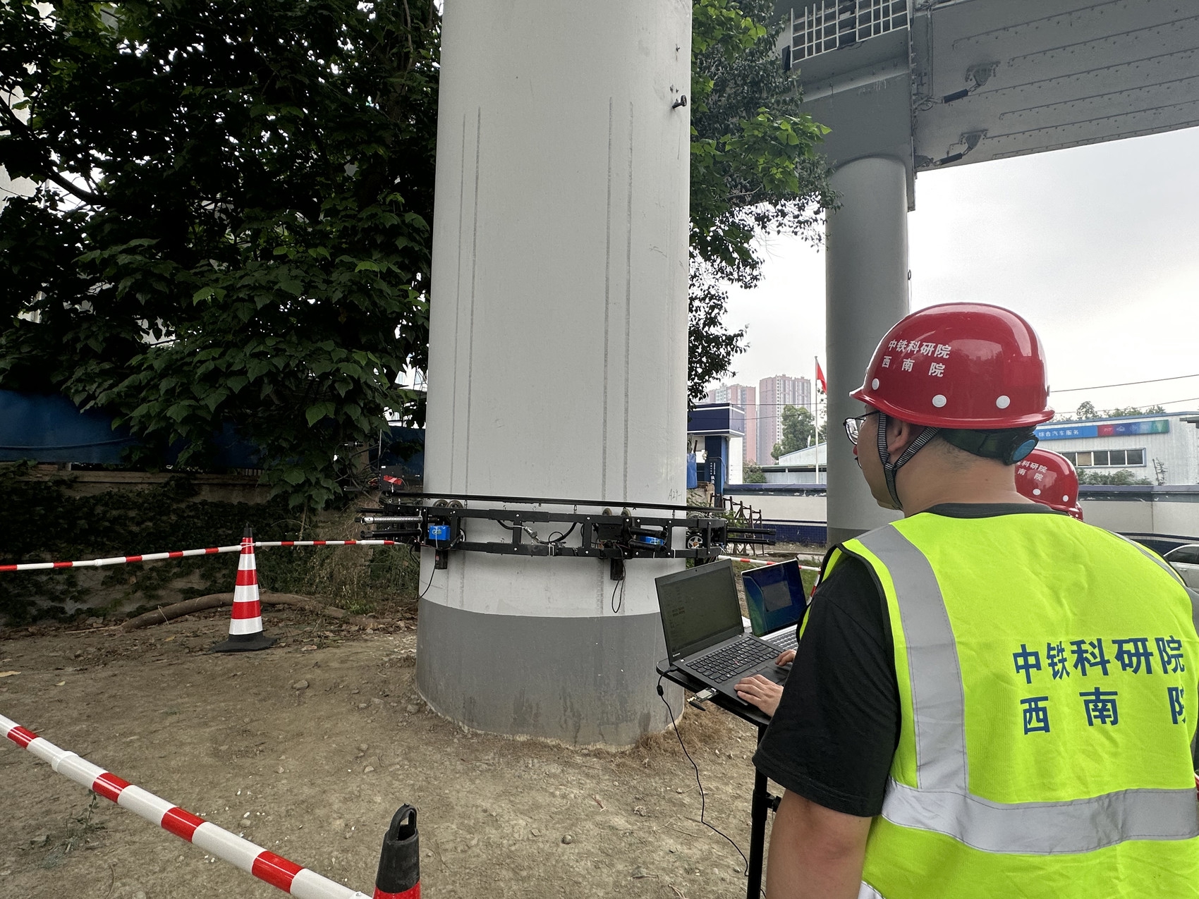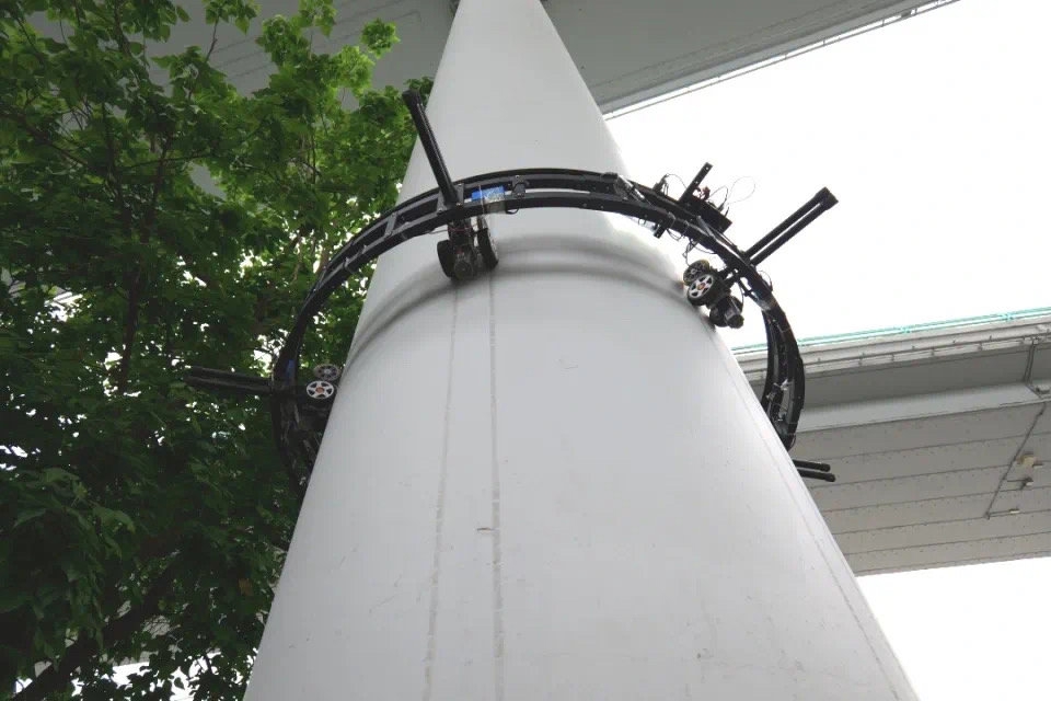 在青龙场立交桥下,成都市道桥监管中心工作人员正在使用墩柱结构环形视觉扫描攀爬作业检测机器人进行检测。只见,工作人员将机器人安装到墩柱上,并将其调整到与桥墩直径相适应的大小,随后操纵遥控器,机器人开始缓缓往上爬。