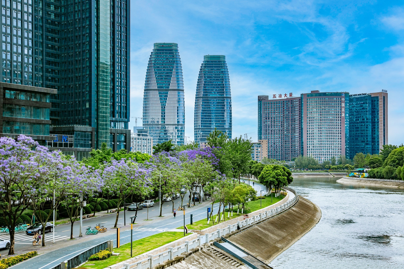 沿着三色路至国华街一路前行,只见道路两旁的蓝花楹花开正盛。一朵朵小喇叭似的蓝紫色花朵挂满树枝,一阵风吹过,花朵随风轻轻摇曳,让整条街道尽显初夏的生机和活力。不远处的锦江之上,波光粼粼、白鹭低飞,和岸边的蓝花楹相映成趣,绘就一幅美妙的城市画卷。