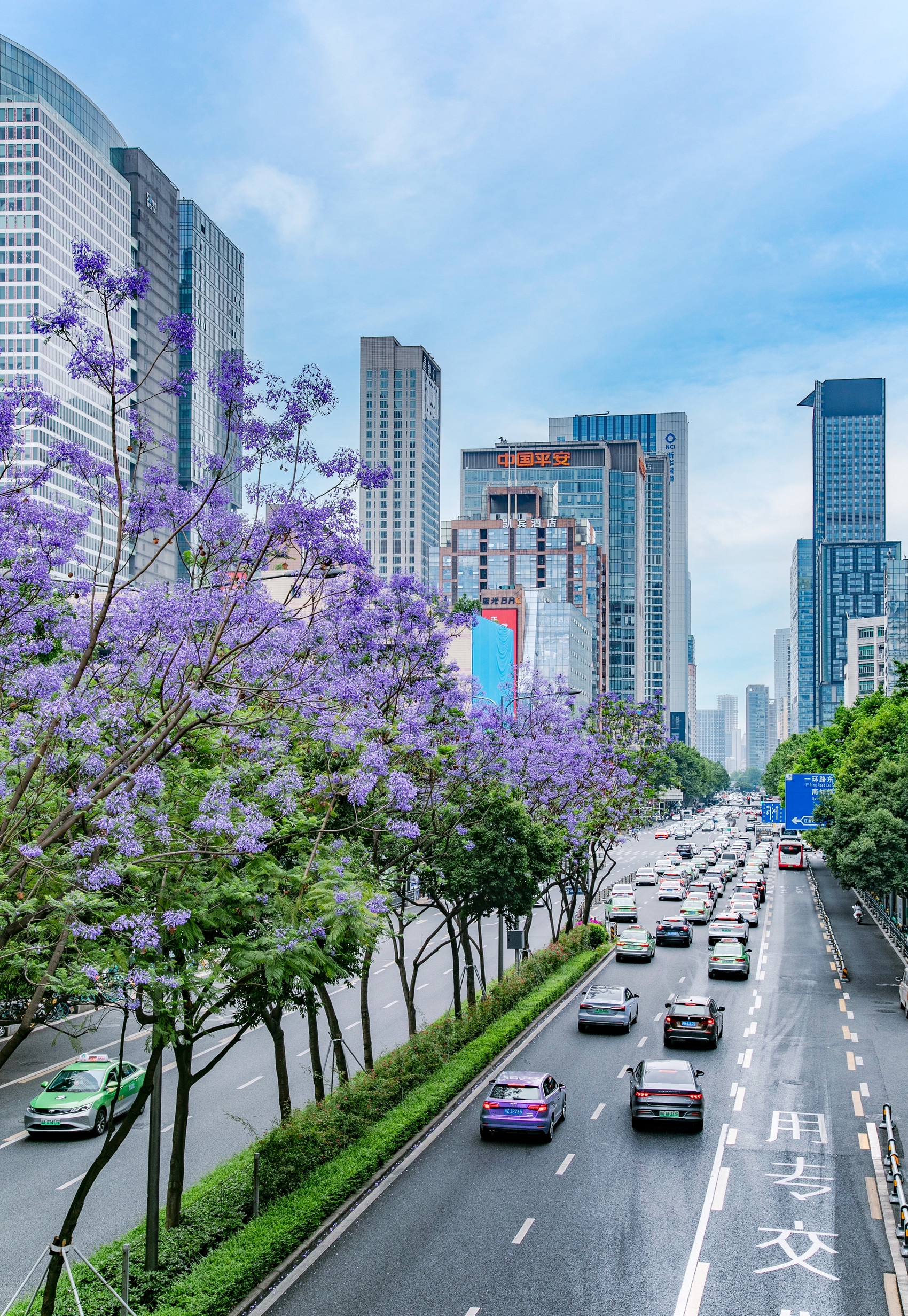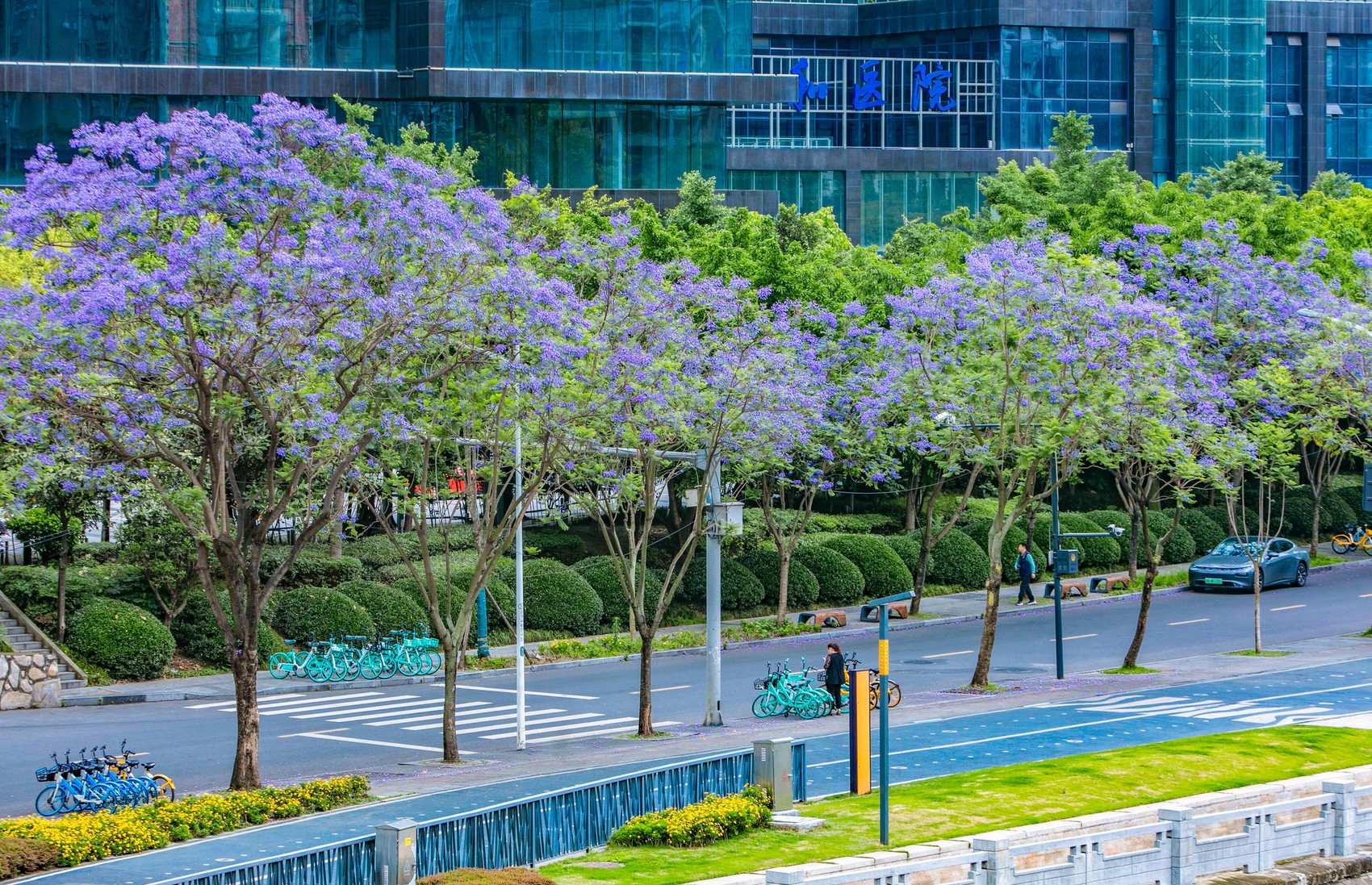 进入5月,在成都市锦江区的街头巷尾,蓝花楹已悄然绽放,蓝紫色的花朵如烟似霞团团簇簇、层层叠叠,为城市增添了清新与浪漫的色彩。