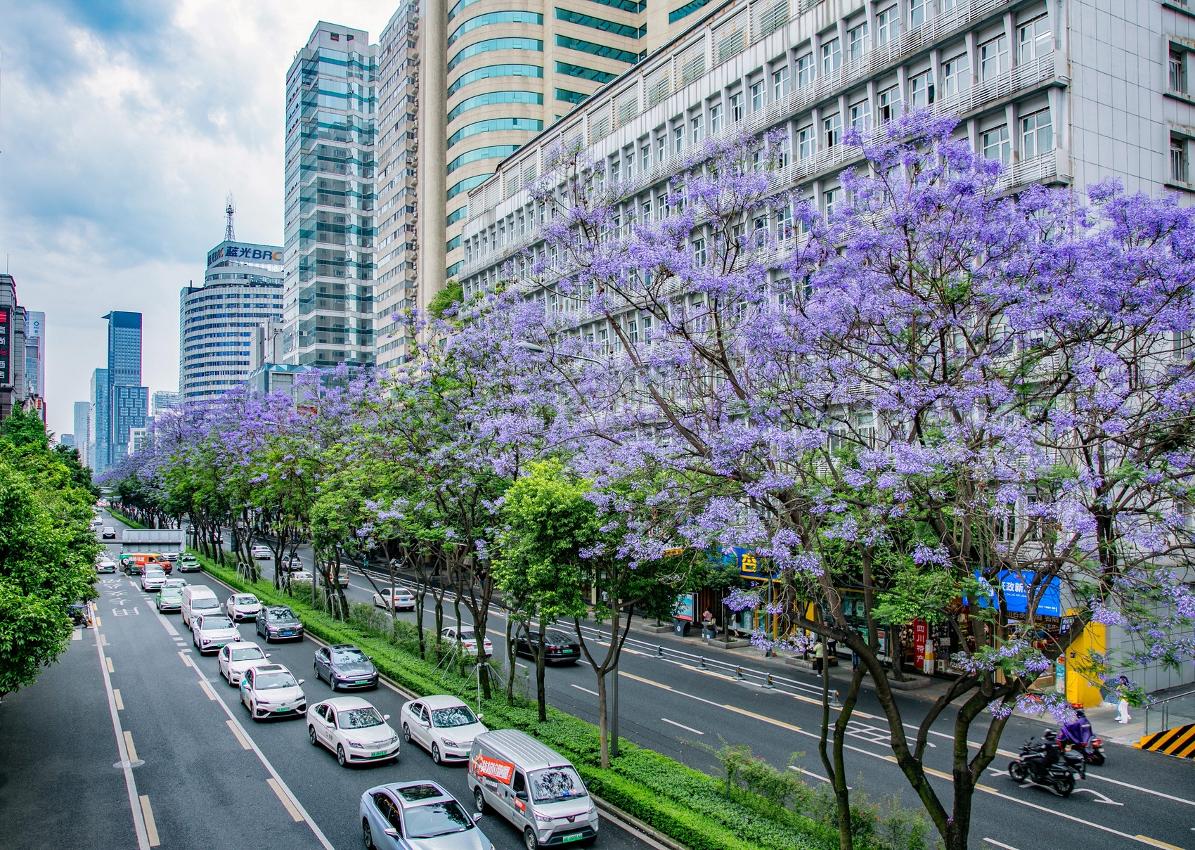 5月的华润路是蓝紫色的,一眼望去,满树的蓝花楹树影婆娑,花开袅袅。蓝花楹树高大的枝干,随意地伸展在街道两旁的建筑物之间。走在蓝花楹树下,蓝紫色的花朵似风铃一般随风摆动,让人仿佛在画中梦里,聆听初夏的告白。