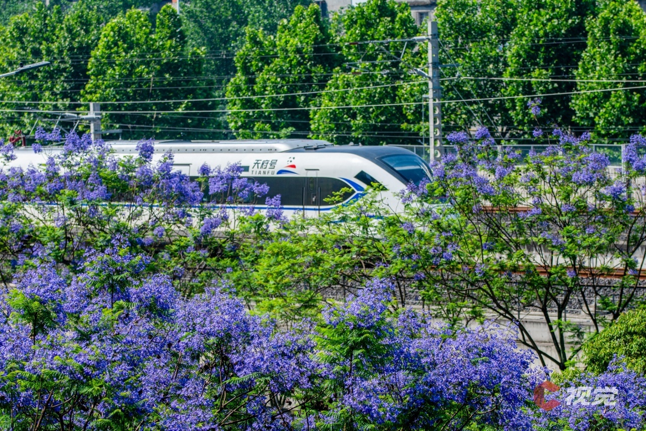 5月13日,成都武晋路,“天府号”动车驶过蓝花楹花海,飞机从蓝天划过,勾勒出一幅美好的夏日风景图。