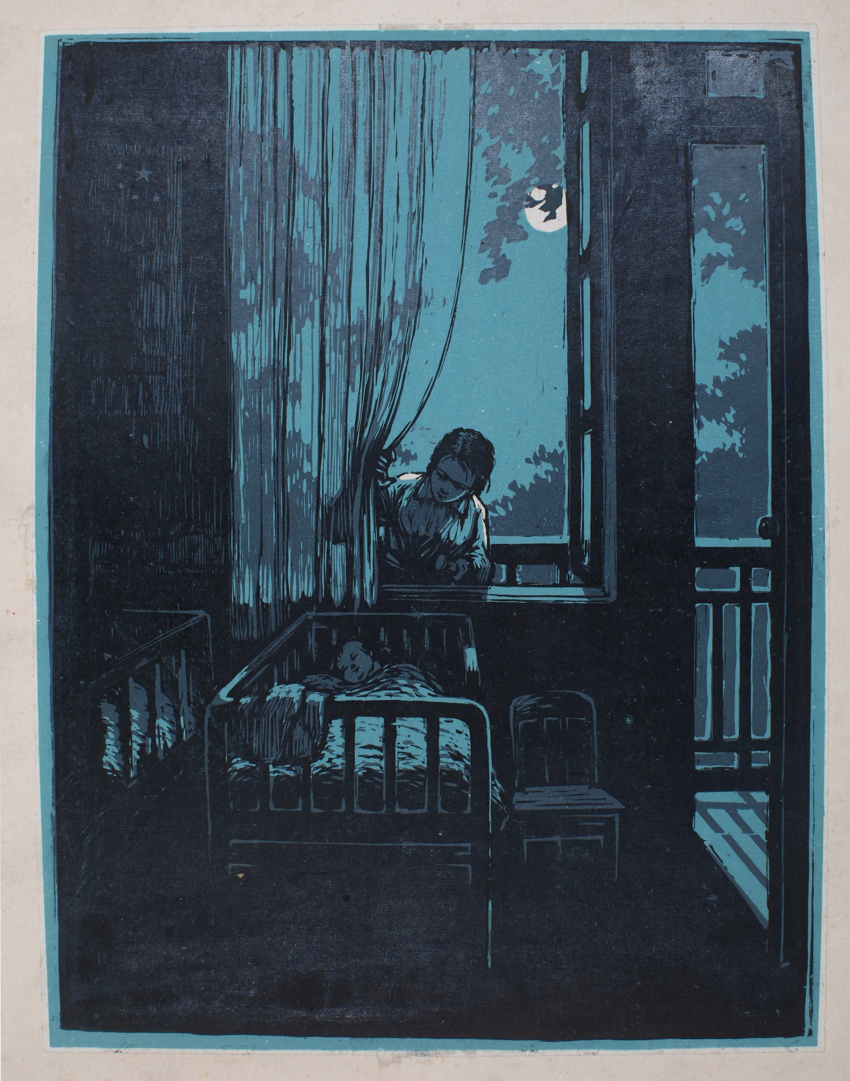 版画家朱宣咸的作品《夜》,表现上世纪50年代幼儿园的幸福生活,画面简练流畅,稳定安详,窗帘的曲线和摇曳的树枝,给人以微风吹动的感觉,营造出一个祥和宁静的世界。