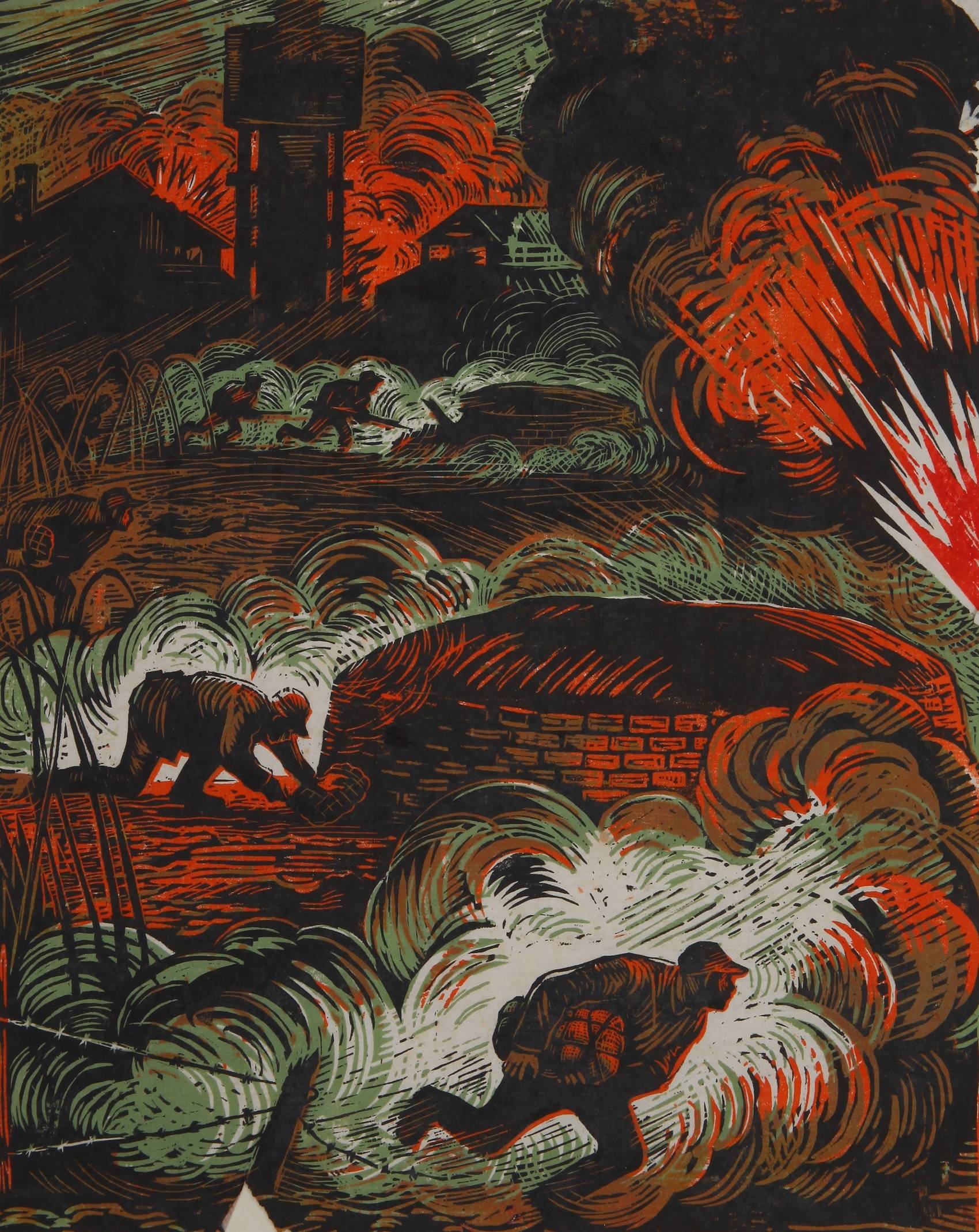 古元 《炸地堡》 套色木刻 25.5cm×20cm 1948年