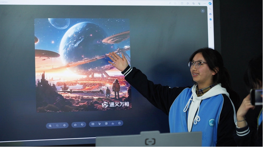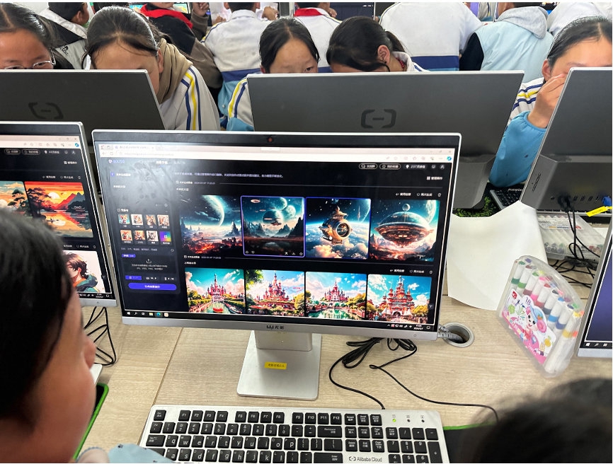 崔原豪等一行人为师生们介绍了计算机的发展史,并将科幻电影融入演讲中,帮助学生了解人类当下的科技和对未来的想象。在实践环节中,石乃亥镇民族小学的学生们还第一次用上国产大模型技术“教AI画画”, 充分释放想象力,用几个简单的提示词就生成了一幅充满未来感的星球基地图。
