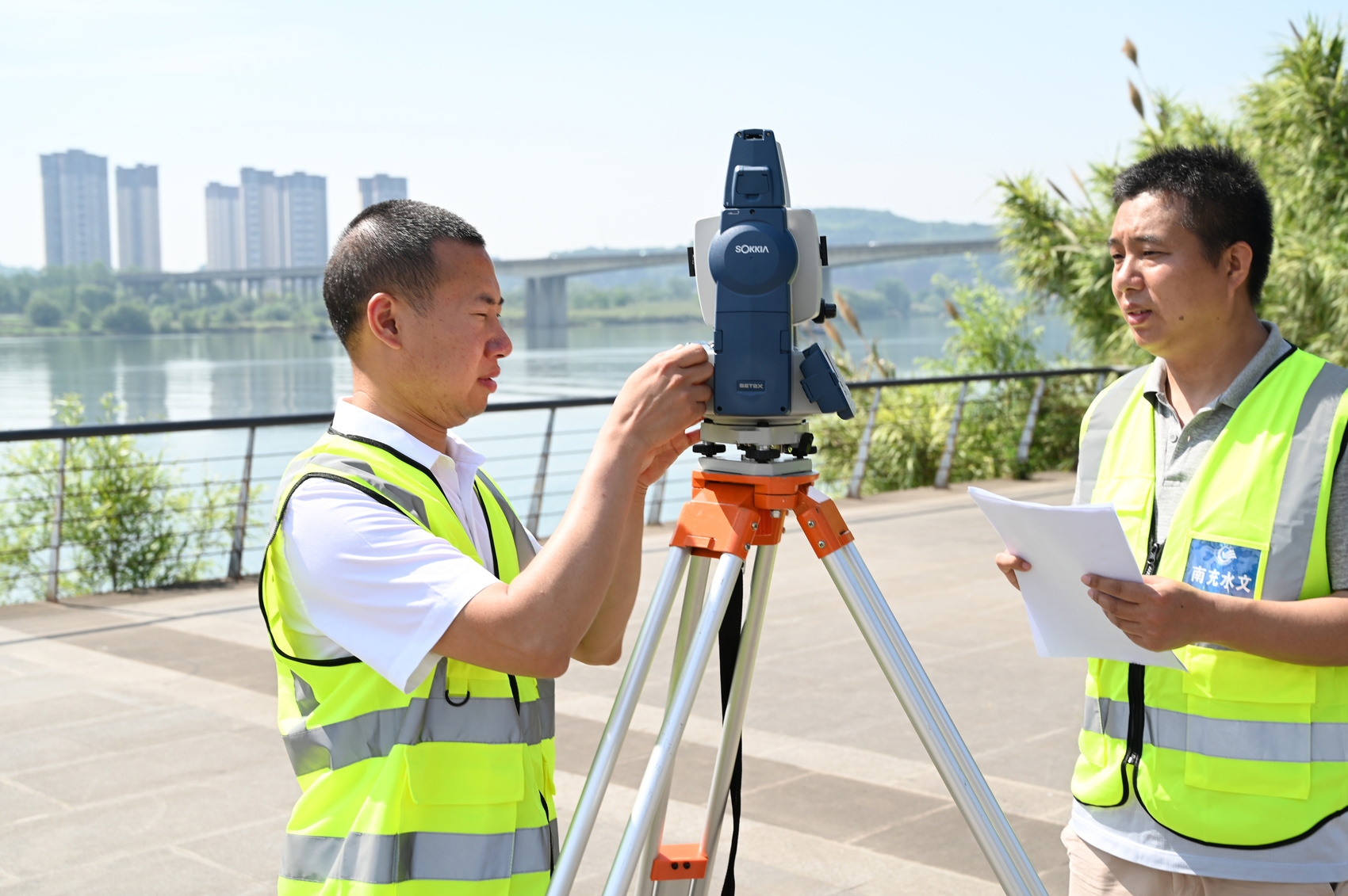 在嘉陵江流域演练中,水文工作人员正用全站型电子速测仪进行地形高程控制测量。廖启华 摄