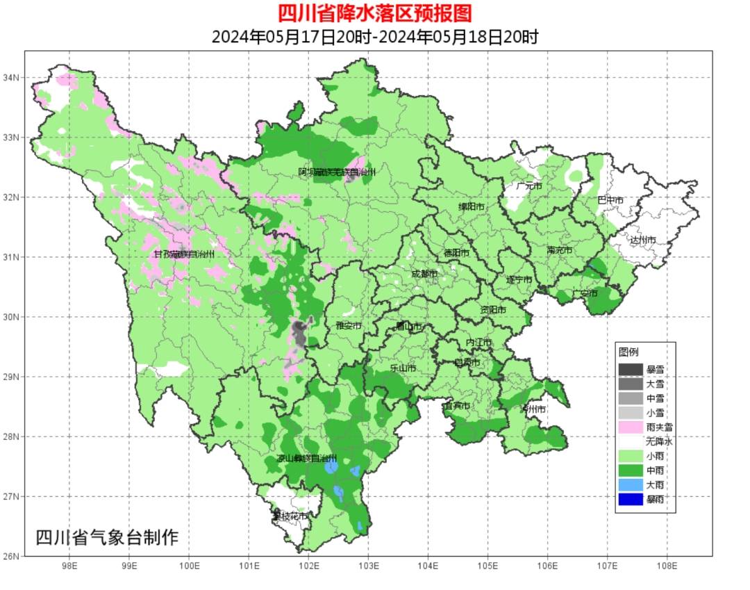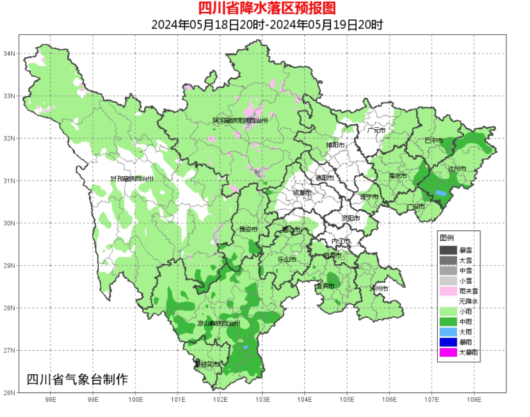 18日晚上到19日白天:盆地大部阵雨转多云,其中达州有中雨,个别地区大雨;川西高原和攀西地区多云间阴有阵雨(雪)或雷雨,其中攀西地区部分地方有中雨。