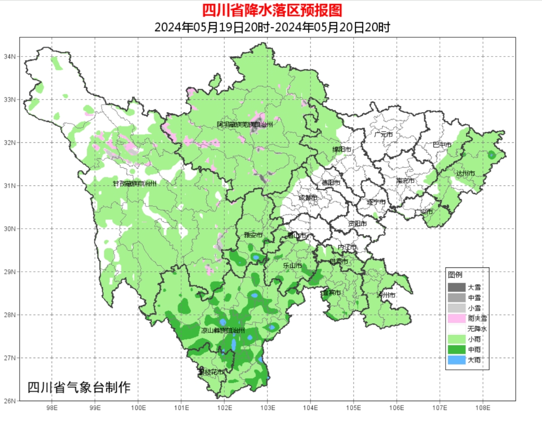 19日晚上到20日白天:盆地大部多云间阴,其中达州、广安、雅安、乐山、自贡、宜宾、泸州7市及西部沿山地区有阵雨或雷雨,局部中雨;川西高原和攀西地区多云间阴有阵雨(雪)或雷雨,其中攀西地区有中到大雨。
