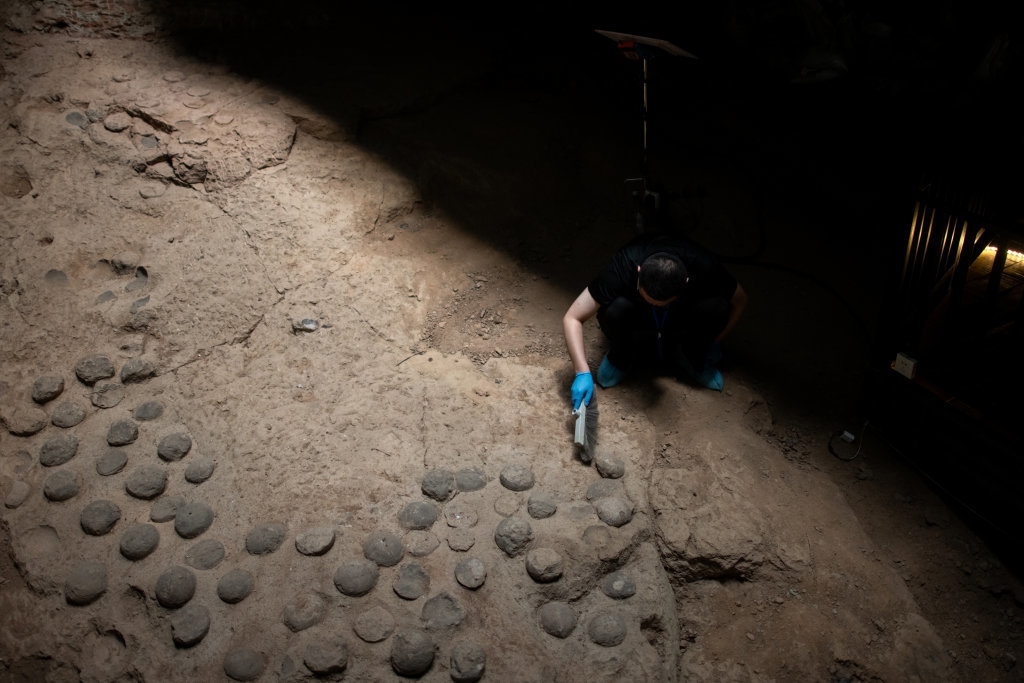 5月16日,联合科研团队科研人员于东祥对博物馆原址保护恐龙蛋化石进行表面清扫。