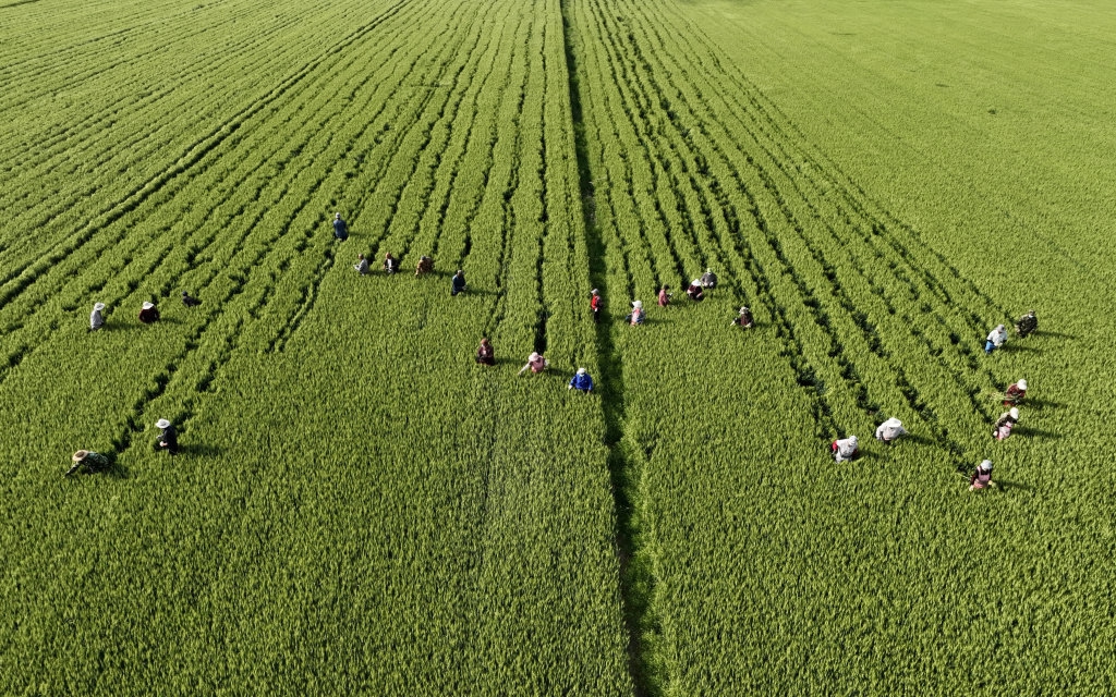 5月16日,河北省晋州市槐树镇北白水村的农民在麦种田内剔除杂穗(无人机照片)。