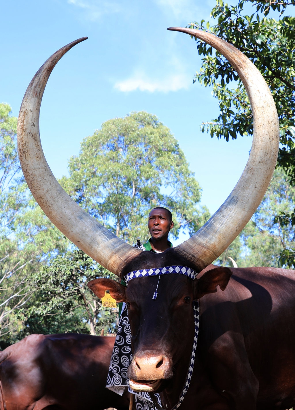 这是4月6日在卢旺达南方省首府尼安扎王宫博物馆拍摄的安科勒牛和饲养员。