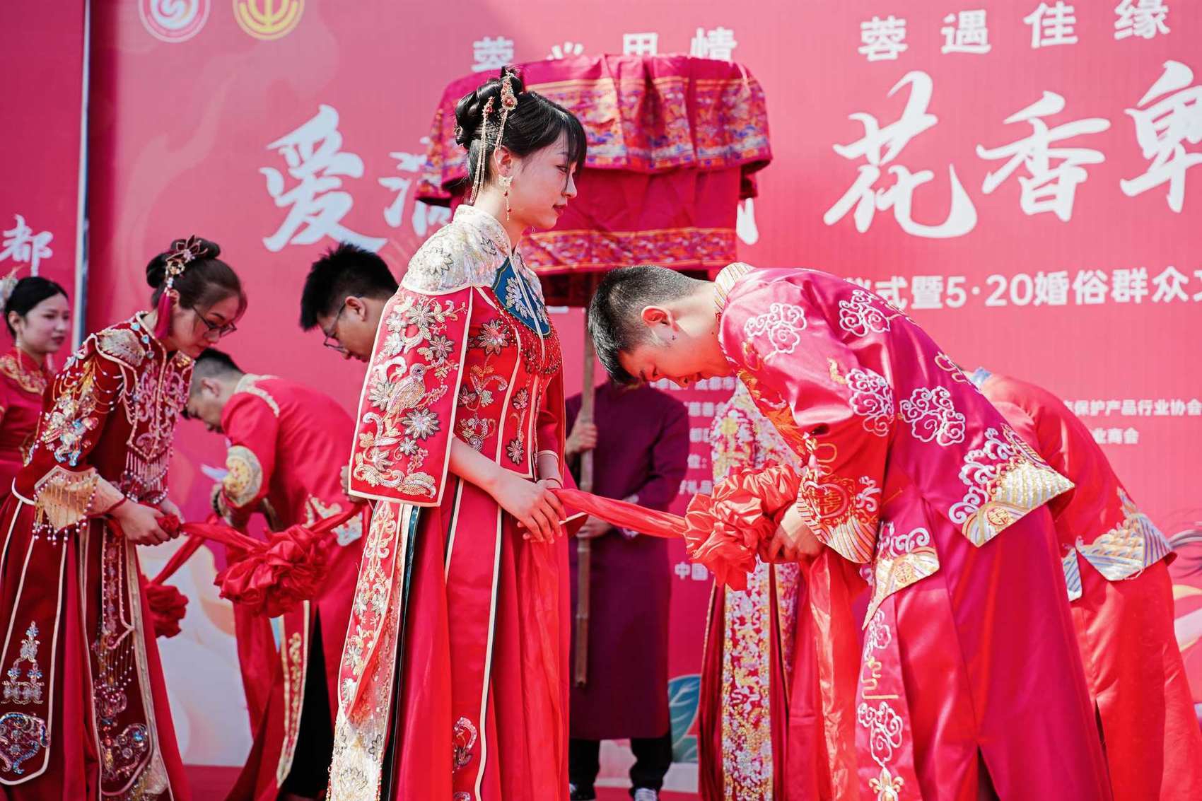 郫都区百合亭婚姻登记处面积约500平方米,外观如同百合花造型,色彩明丽清新,是蝴蝶村的地标性建筑之一,“揭牌”当天就吸引了80余对情侣前来领证。牵绣球、跨火盆、正衣冠、夫妻交拜、结发礼、合卺礼……百合亭婚姻登记处邀请了10对新人现场体验传统婚俗礼仪,并为他们颁发结婚证,6对金婚老人现场分享爱的秘决,倡导珍惜、守护、追求幸福美满的婚姻生活。