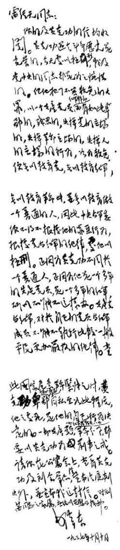 你的及黄克功的信均收阅。黄克功过去斗争历史是光荣的,今天处以极刑,我及党中央的同志都是为之惋惜的。但他犯了不容赦免的大罪,以一个共产党员红军干部而有如此卑鄙的,残忍的,失掉党的立场的,失掉革命立场的,失掉人的立场的行为,如为赦免,便无以教育党,无以教育红军,无以教育革命者,并无以教育做一个普通的人。因此中央与军委便不得不根据他的罪恶行为,根据党与红军的纪律,处他以极刑。正因为黄克功不同于一个普通人,正因为他是一个多年的共产党员,是一个多年的红军,所以不能不这样办。共产党与红军,对于自己的党员与红军成员不能不执行比较一般平民更加严格的纪律。当此国家危急革命紧张之时,黄克功卑鄙无耻残忍自私至如此程度,他之处死,是他的自己行为决定的。一切共产党员,一切红军指战员,一切革命分子,都要以黄克功为前车之戒。请你在公审会上,当着黄克功及到会群众,除宣布法庭判决外,并宣布我这封信。对刘茜同志之家属,应给以安慰与抚恤。