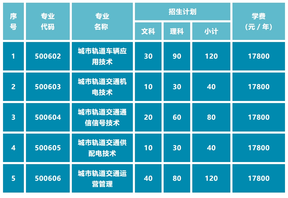 首批招生专业为城市轨道车辆应用技术、城市轨道交通机电技术、城市轨道交通通信信号技术、城市轨道交通供配电技术、城市轨道交通运营管理。