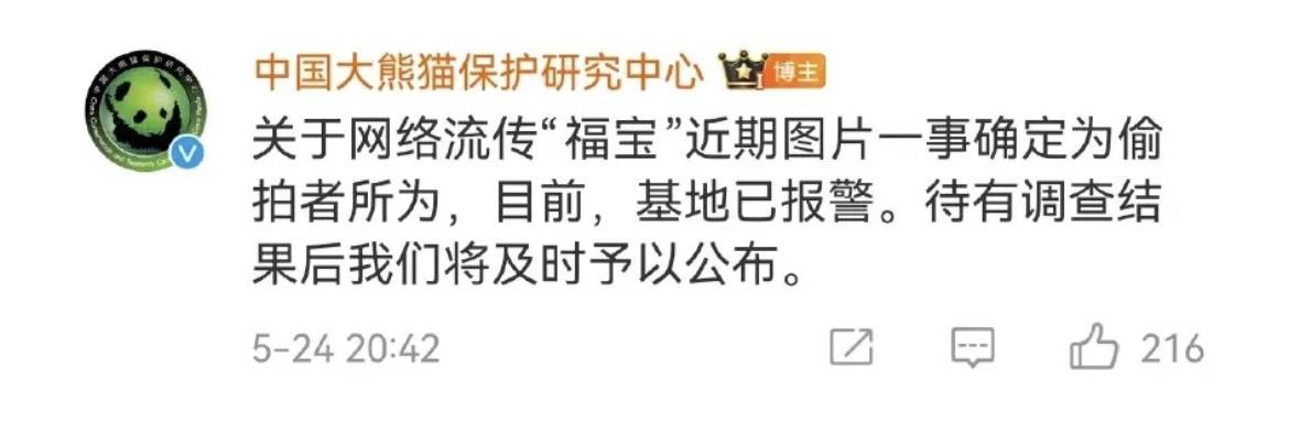 5月24日,熊猫中心回应称,流传的“福宝”近期图片系偷拍者所拍,目前熊猫中心已报警,待有调查结果后将及时公布。