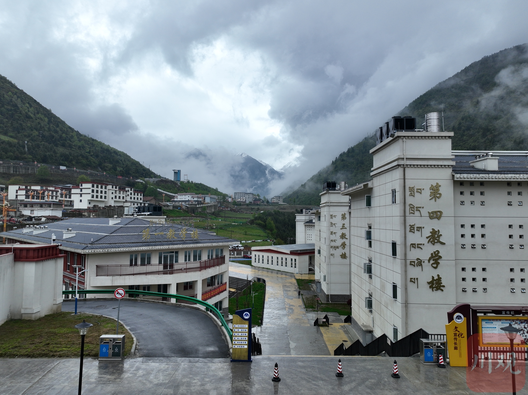 5月15日雨后初霁,站在康定市第二中学,可以远眺到远处的雪山。走进这所雪山下的中学,可以看到很多浙江元素:“学苑餐厅”楼的外墙上贴有“杭州楼”三个金色大字,思源楼意为“饮水思源”,还有阿里巴巴的科技公益项目的云机房……